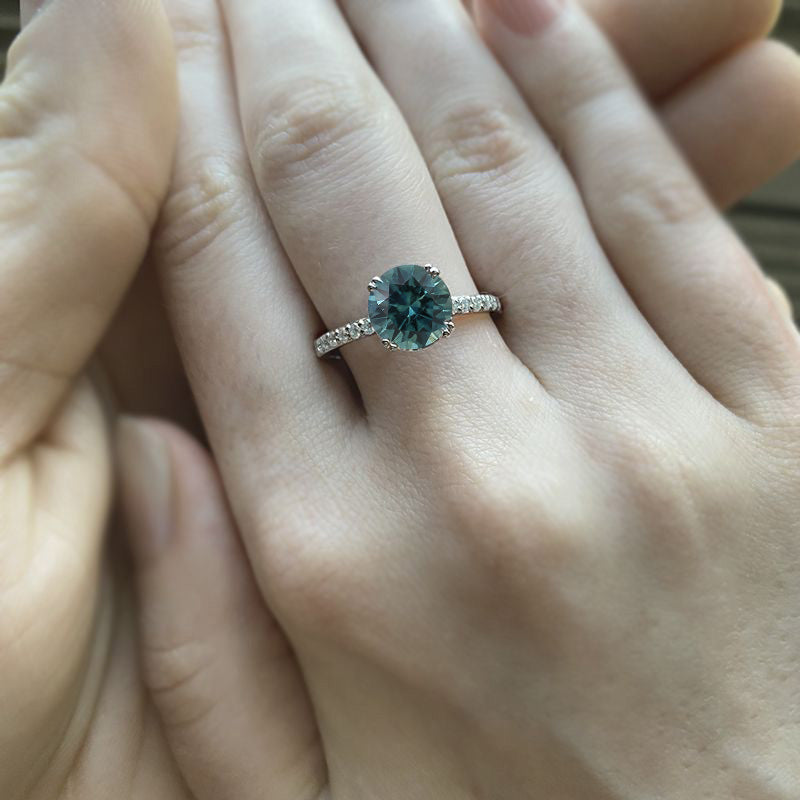 On the image featured 2.0 carat round Ethically Lab-Grown Teal Sapphire with 24 - 0.2 CTW D-Colorless, VVS1 clarity moissanite accent stones and 14K white gold ring.