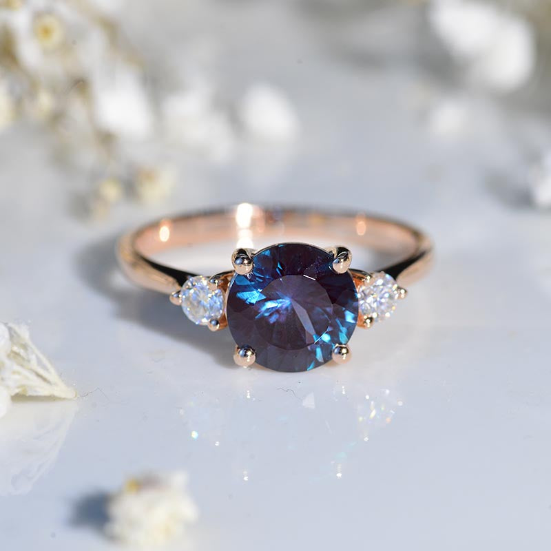 The default design option features 8mm Portuguese Cut Ethically LAB-Grown Alexandrite Center Stone VG-Cut, Ex-Polish, VG-Symmetry