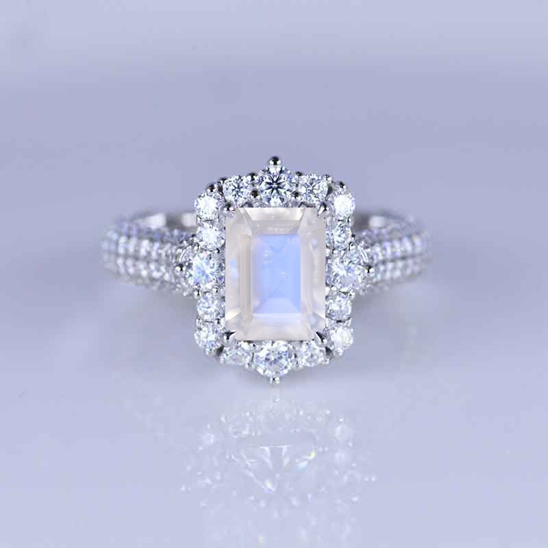 The default design option features 2 Carat 8x6mm Emerald Cut Genuine MoonstoneCenter Stone set with 1.2 CTW Accent Stone: D-Colorless, VVS1-Clarity, VG-Cut, Ex-Polish, VG-Symmetry, Set with Colorless Moissanite Accent stones in 14K White Gold Engagement Ring.