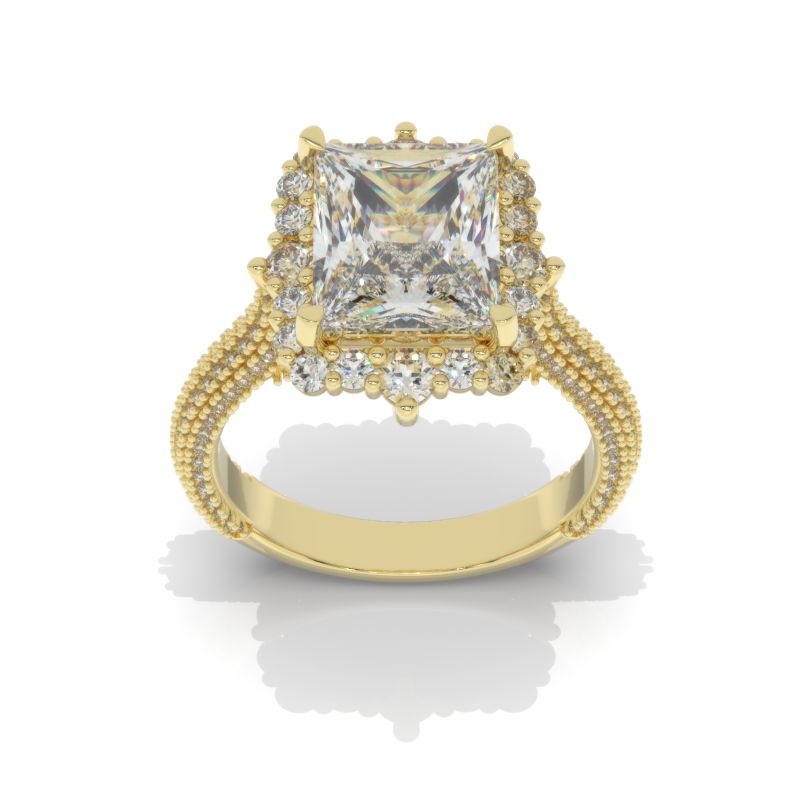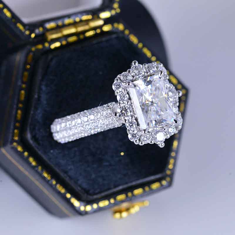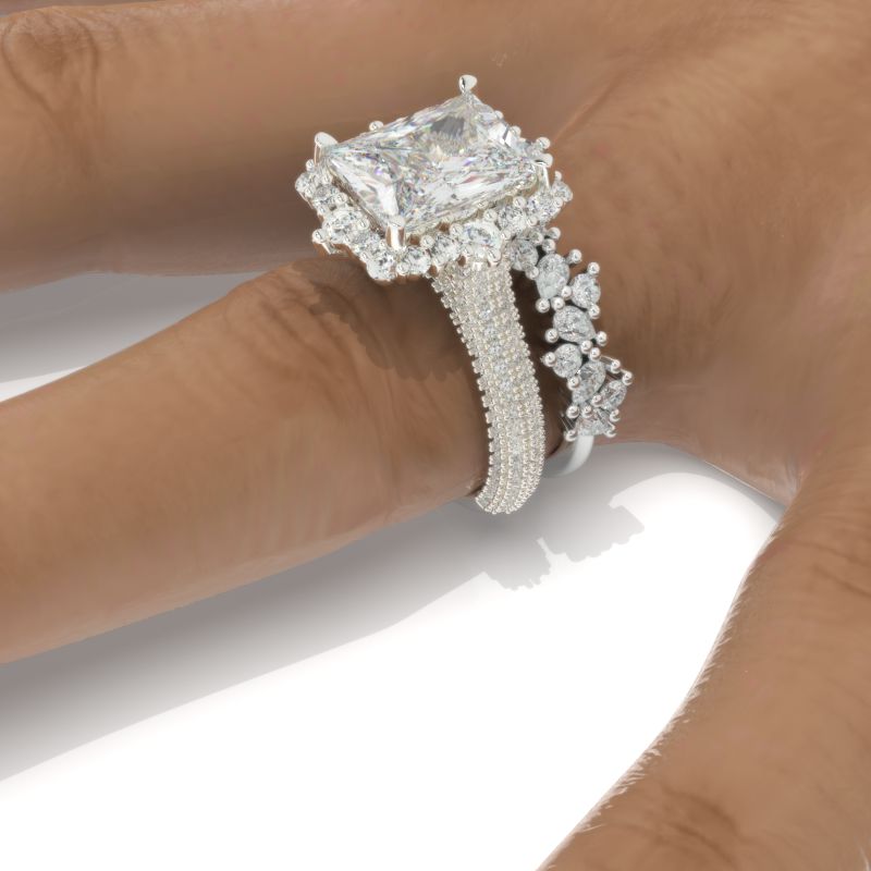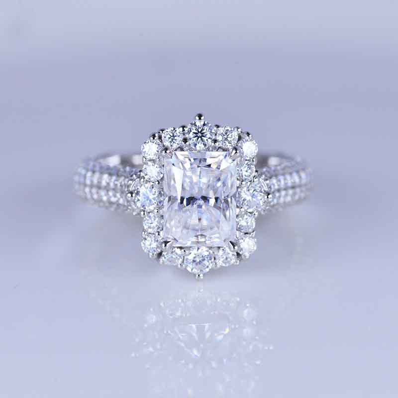 The default design option features 2 Carat 8x6mm Radiant Cut Giliarto Moissanite Center Stone set with 1.2 CTW Accent Stone: D-Colorless, VVS1-Clarity, VG-Cut, Ex-Polish, VG-Symmetry, Set with Colorless Moissanite Accent stones in 14K White Gold Engagement Ring.
