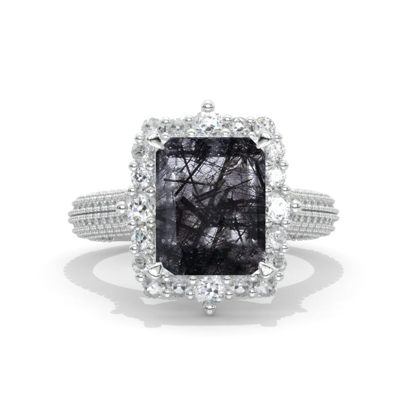 The default design option features 2 Carat 8x6mm Radiant Cut Natural Rutilated Quart Center Stone set with 1.2 CTW Accent Stone: D-Colorless, VVS1-Clarity, VG-Cut, Ex-Polish, VG-Symmetry, Set with Colorless Moissanite Accent stones in 14K White Gold Engagement Ring.