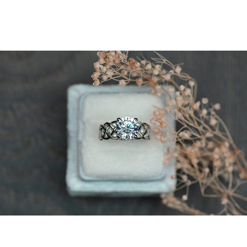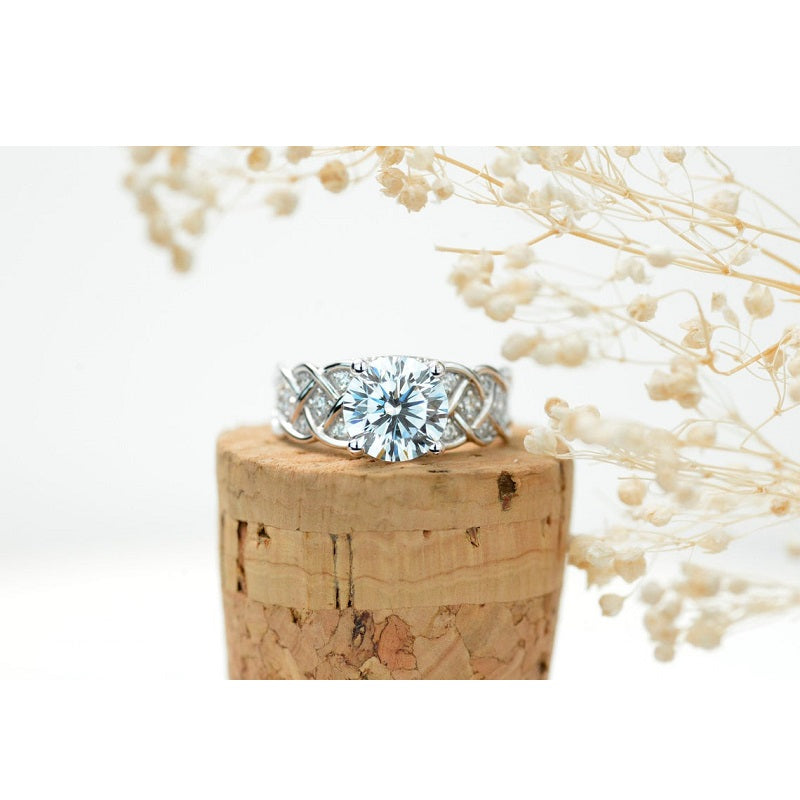 The default design option features Round Cut 8 mm Center Moissanite Stones DEF color, VVS1 - Clarity, VG-Cut, Ex-Polish, VG-Symmetry