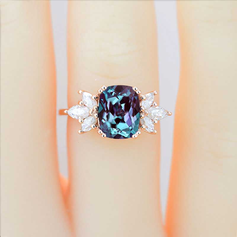 Cushion Shape Engagement ring with Ethically Lab-Grown Alexandrite Accents Stones Ring.