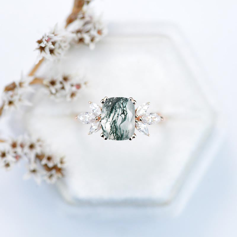 Setting: 14K Rose Gold (Available in Yellow Gold and Rose Gold) Center Stone: 2 Carat - 9x7mm Cushion Cut Genuine Moss Agate Side Stones: Marquees Moissanite Color: D-F Clarity: VS2-Si1 Cut: Excellent The total approximate weight of side stones: 0.7ctw Model 511-9x7mm