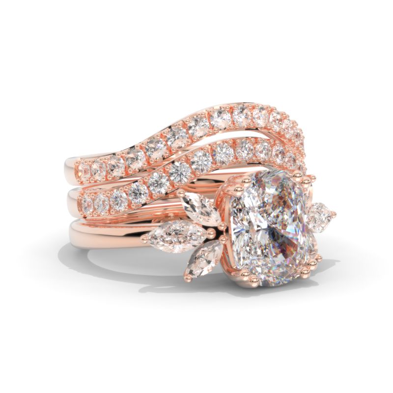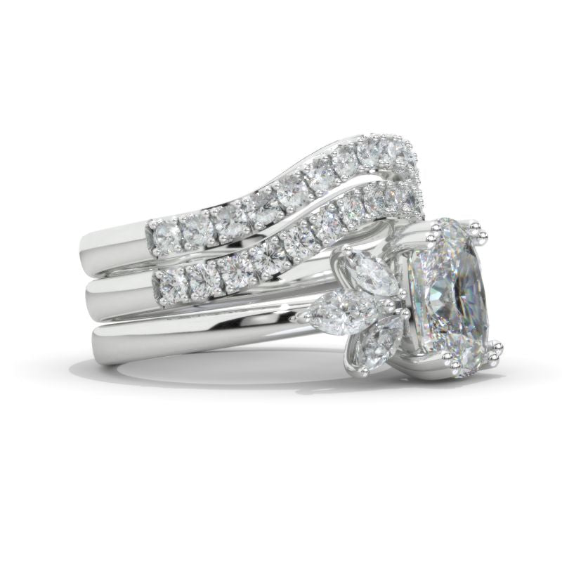 Cushion Shape Engagement ring with Marquise Shape Accents Stones Three Ring Set.