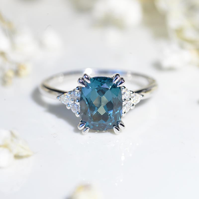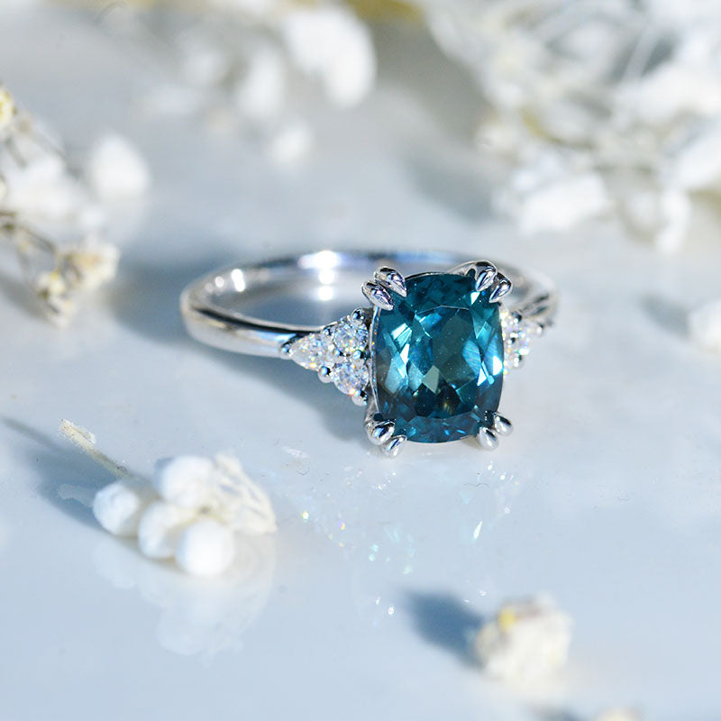 The default design option features 9x7mm Cushion Ethically Lab-Grown Teal Sapphire Stone
