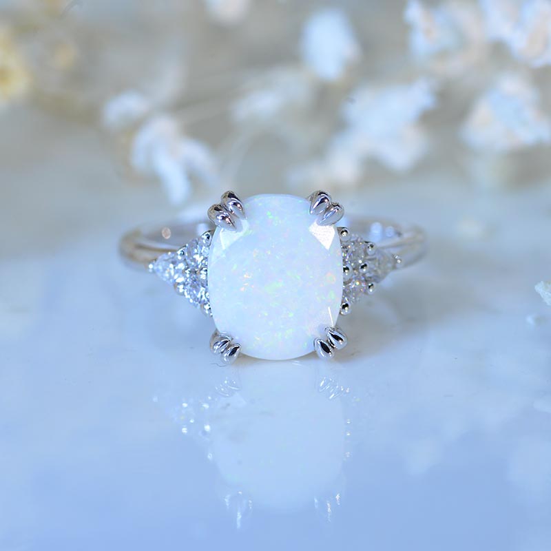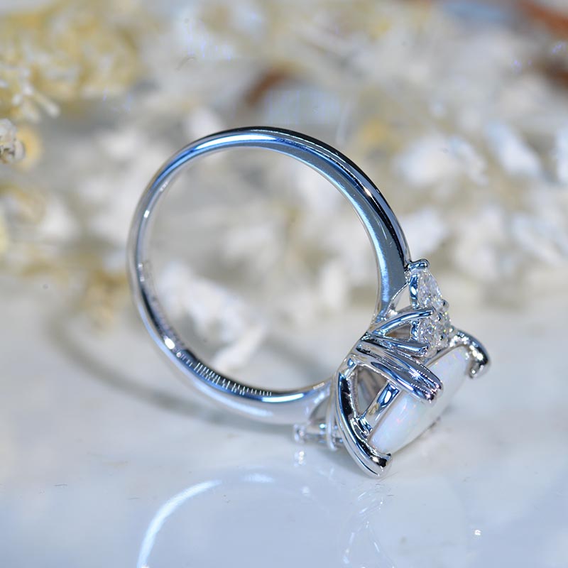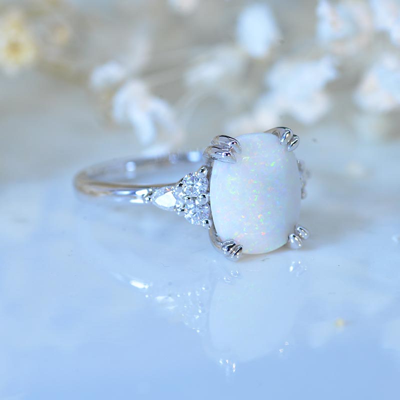 The default design option features 9x7mm Cushion Natural White Opal Stone