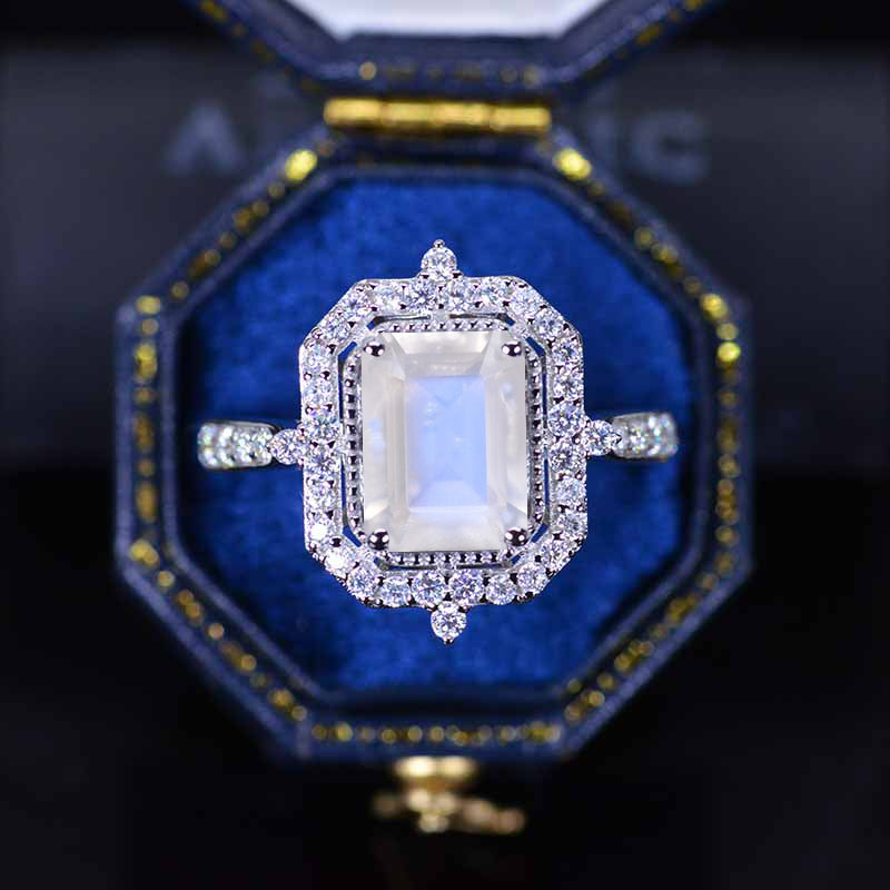 The default design option features 8x6mm Emerald Cut Genuine Moonstone VVS1-Clarity, VG-Cut, Ex-Polish, VG-Symmetry set with D-Colorless Moissanite Accents