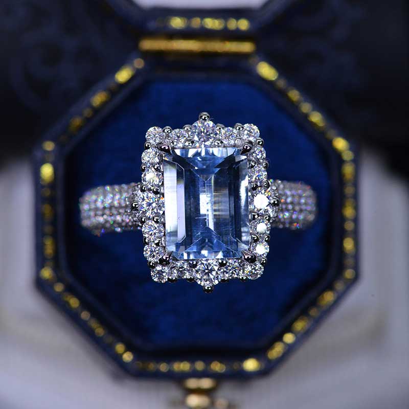 3Ct Genuine Aquamarine Engagement Ring Halo Emerald Step Cut Aquamarine Engagement Ring