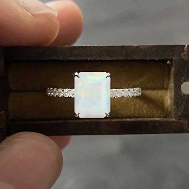2Ct Genuine White Opal Engagement Ring, Radiant Cut Genuine White Opal Engagement Ring, Genuine White Opal Pave Accents Stones Hidden Halo with Eternity Ring Set