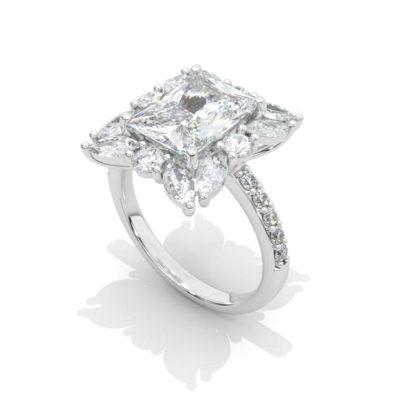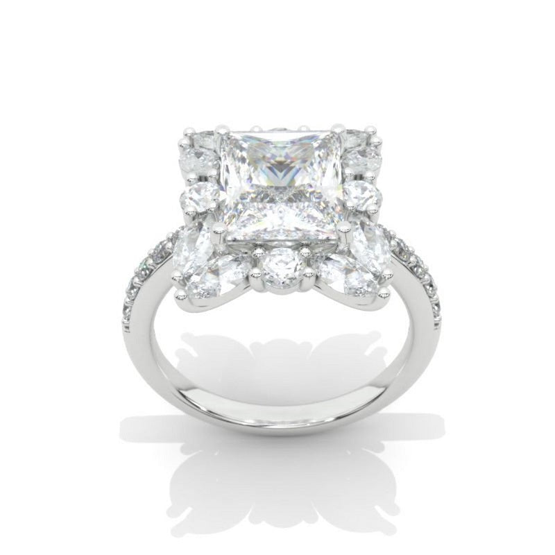 The default design option features 8x6mm Emerald Cut LAB-Grown Diamond Classic Halo Accent Stones, Emerald ShapeD-Colorless, VVS1-Clarity, VG-Cut, Ex-Polish, VG-Symmetry, Set with Colorless LAB-Grown Diamond Accent stones in 14K White Gold Engagement Ring.