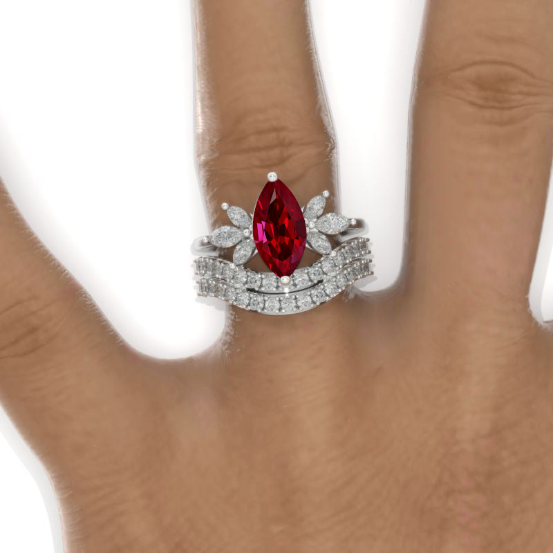 Marquise Shape Engagement ring with Marquise Shape Accents Stones Three Ring Set. Setting: 14K White Gold (Available in Yellow Gold and Rose Gold) Center Stone: 2 Carat - 12x6mm Marquise Cut Ethically Lab-Grown Ruby AAA+ Grade Side Stones: Marquees Moissanite Color: D-F Clarity: VS2-Si1 Cut: Excellent The total approximate weight of side stones: 0.7ctw Shank width: 2mm