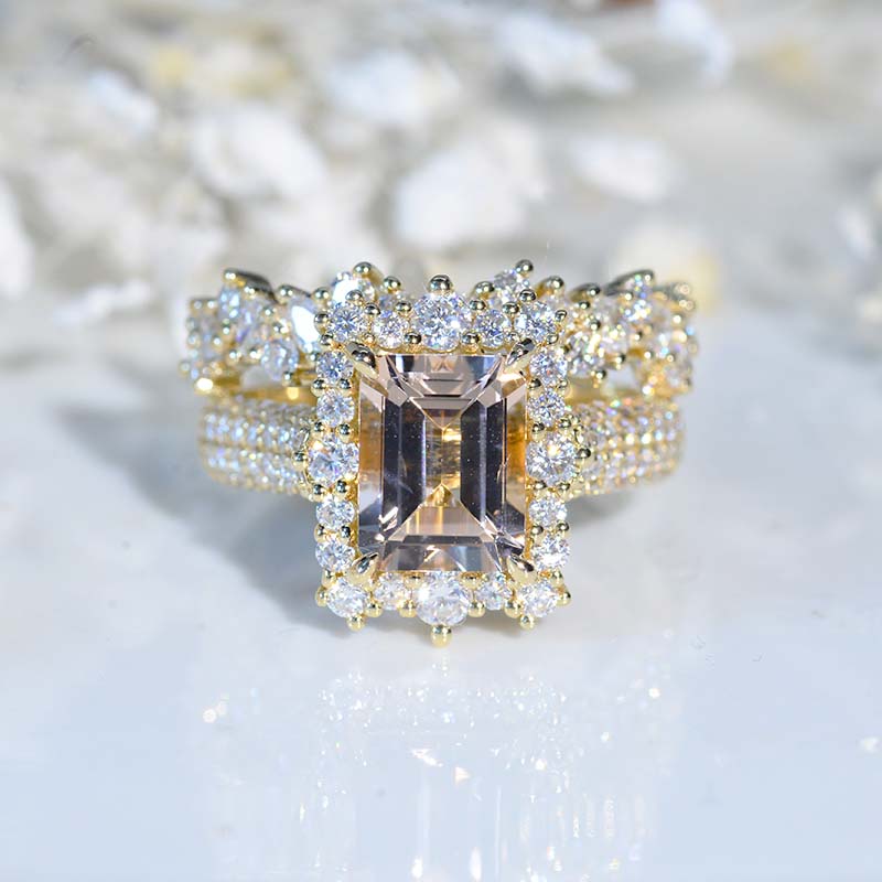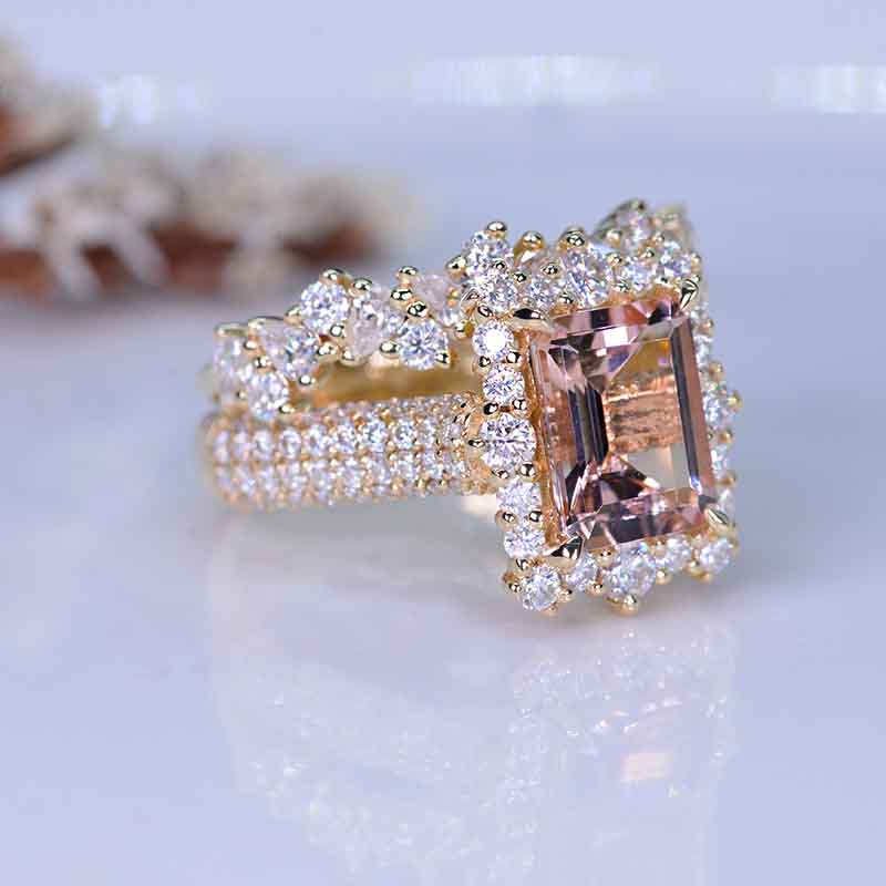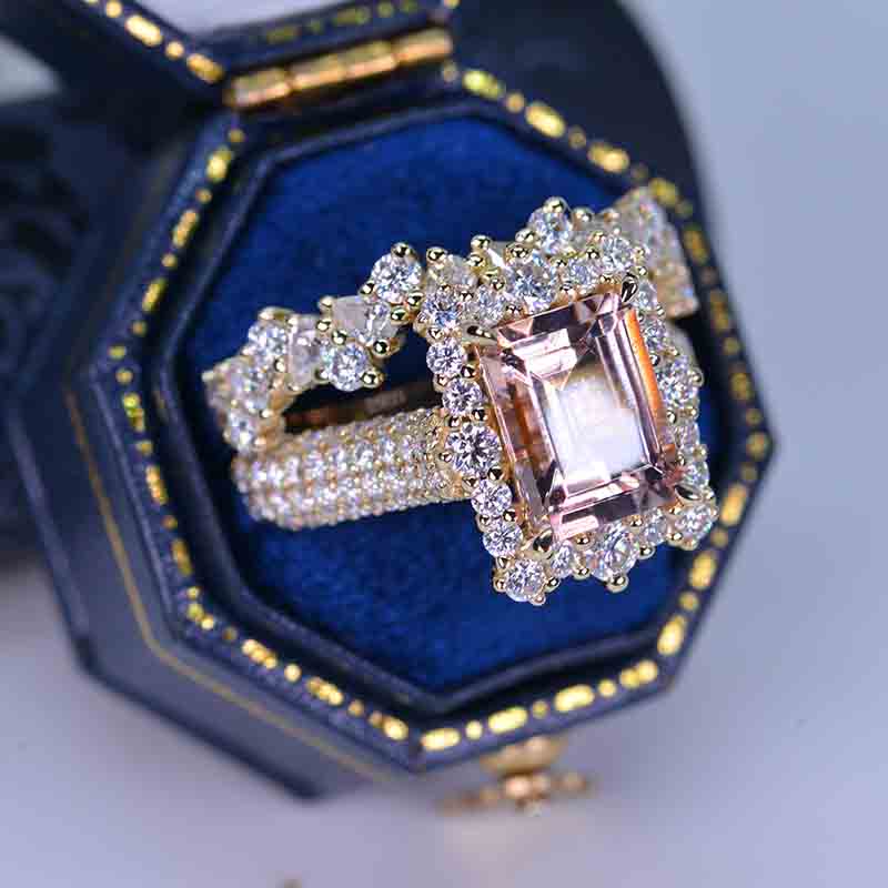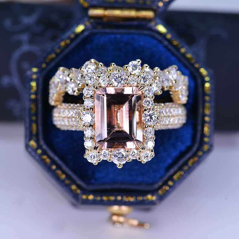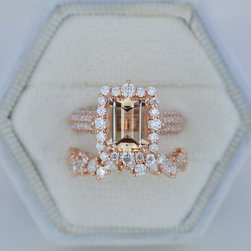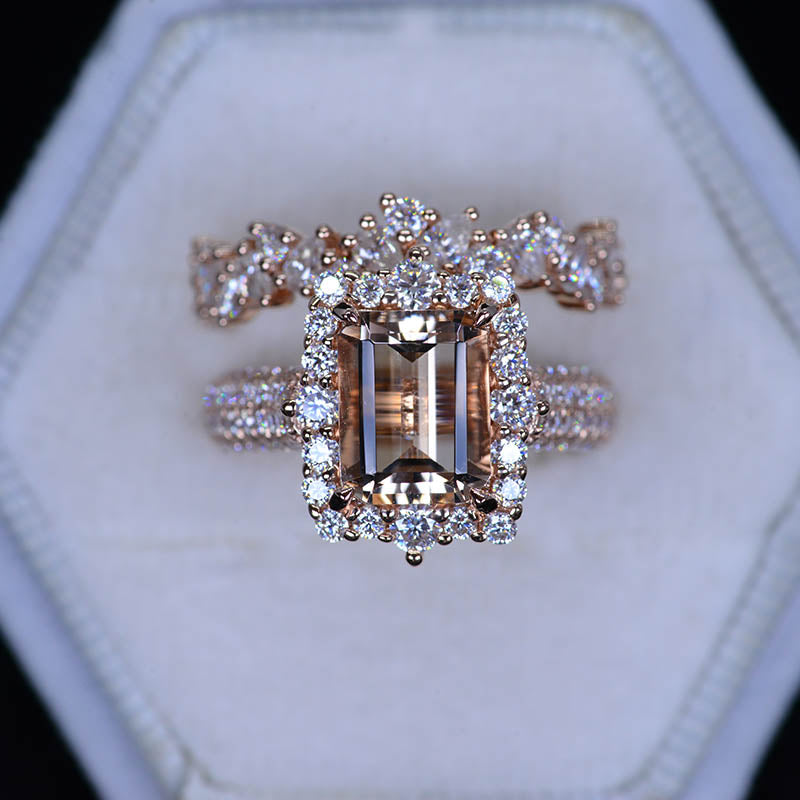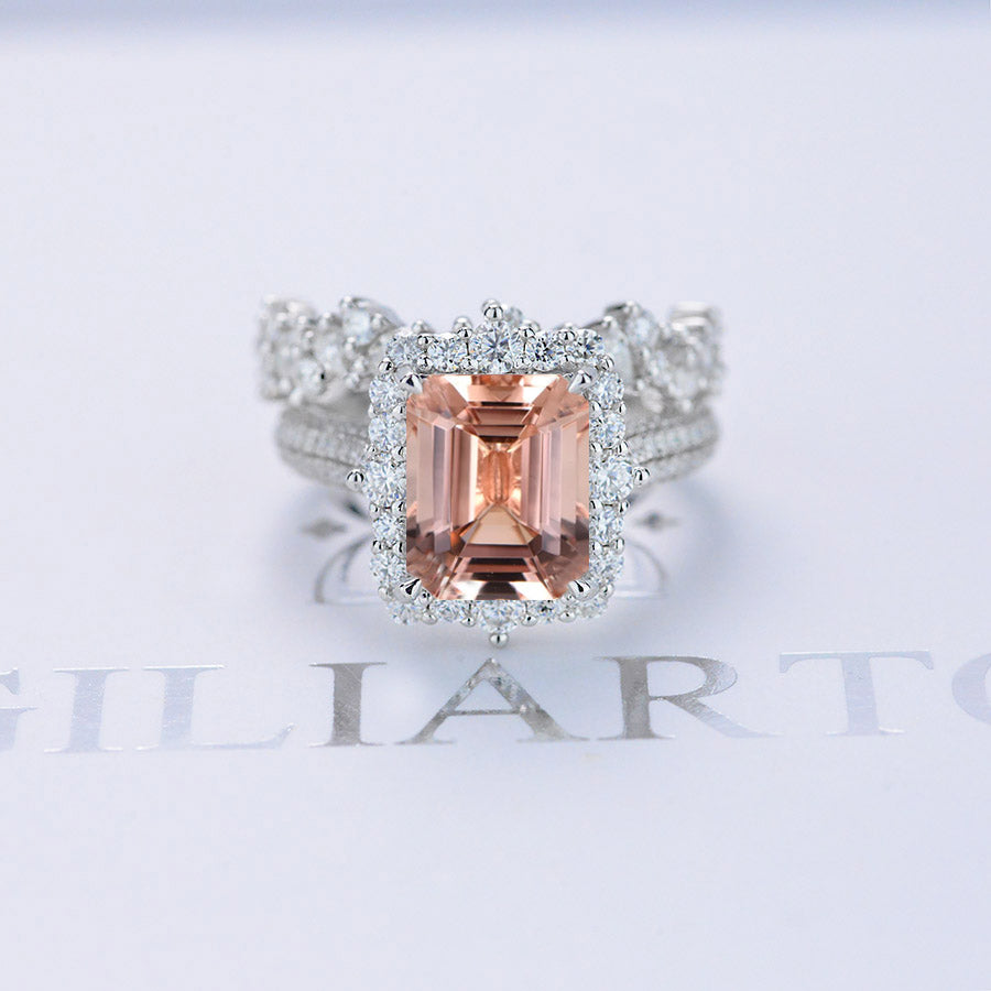 3 Carat Emerald Cut Natural Morganite Center Stone Engagement ring set.