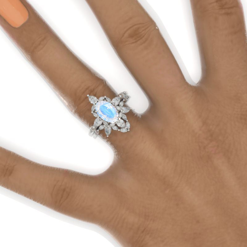 2CT Oval Halo Genuine Natural Moonstone Vintage Wedding Ring Set. 14K Solid Gold Engagement Ring Anniversary Ring, Halo Ring Set