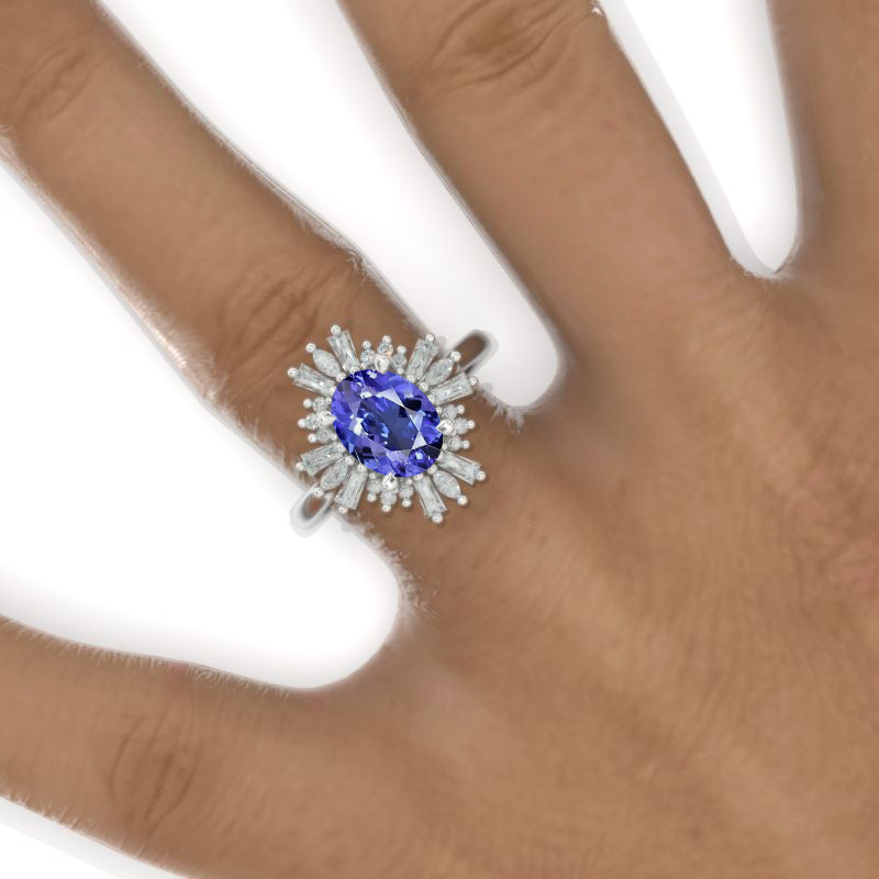 The default design option features 2 Carat Natural Genuine Tanzanite 9x7mm Oval Center Stone, VG-Cut, Ex-Polish, VG-Symmetry set with D- Colorless Moissanite Accent Stones