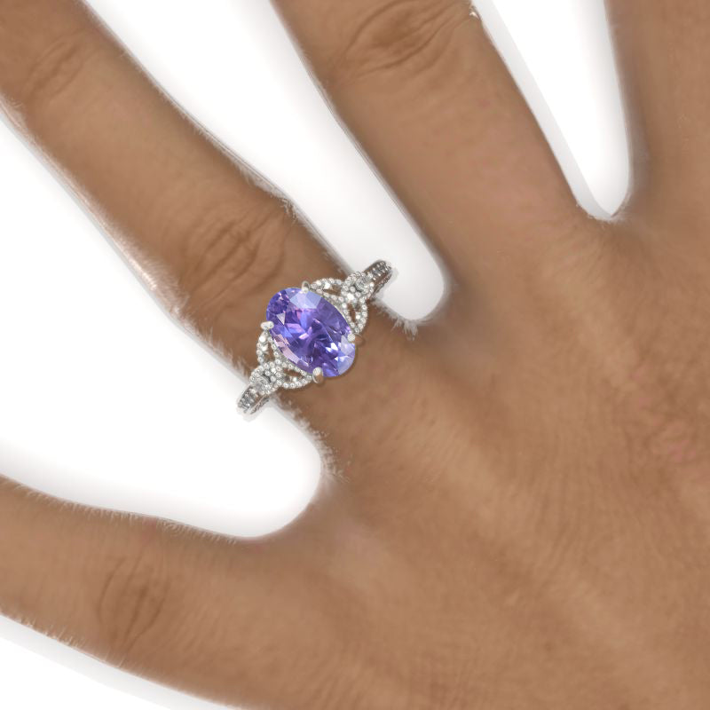 The default design option features 2 Carat Ethically Lab-Grown Purple Sapphire 10x7mm Oval Center and Accent Stones : D-Colorless, VVS1-Clarity, VG-Cut, Ex-Polish, VG-Symmetry