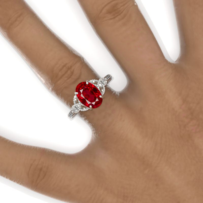 The default design option features 2 Carat Ethically Lab-Grown Ruby AAA+ Grade 10x7mm Oval Center and Accent Stones : D-Colorless, VVS1-Clarity, VG-Cut, Ex-Polish, VG-Symmetry