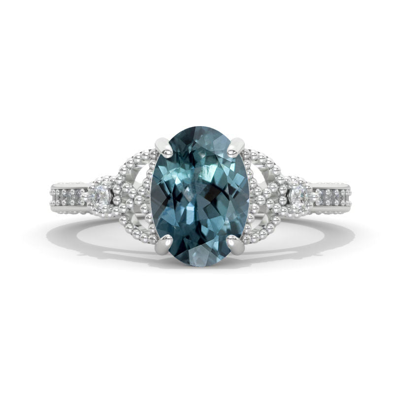 The default design option features 2 Carat Ethically Lab-Grown Tea lSapphire 10x7mm Oval Center and Accent Stones : D-Colorless, VVS1-Clarity, VG-Cut, Ex-Polish, VG-Symmetry