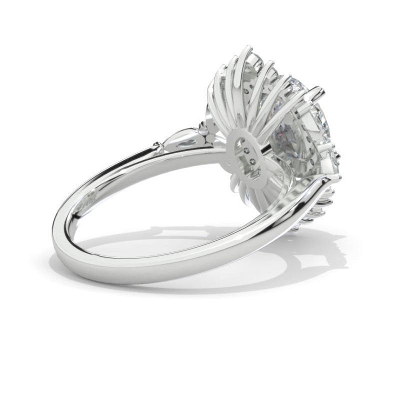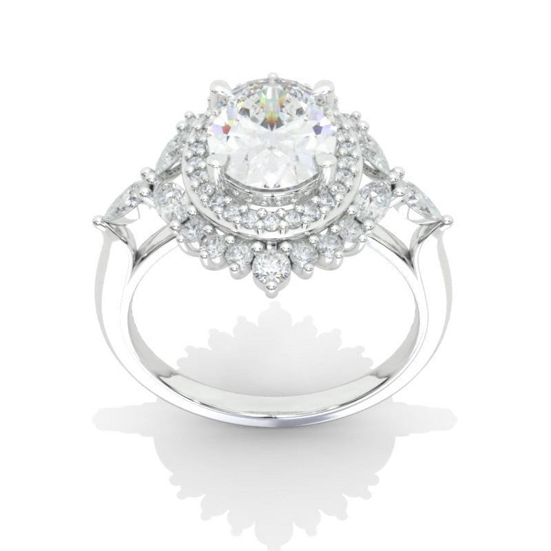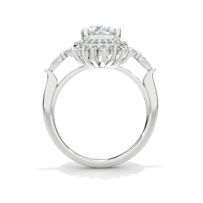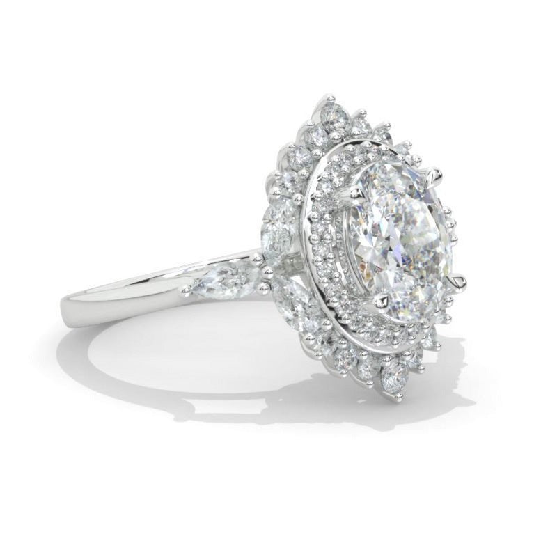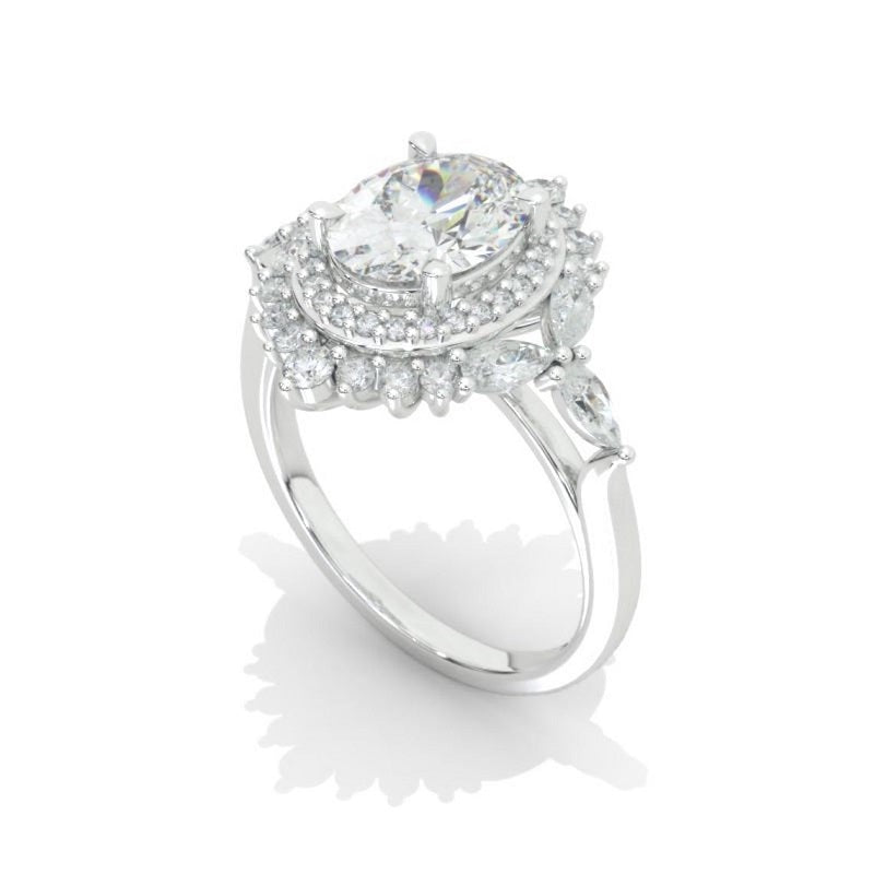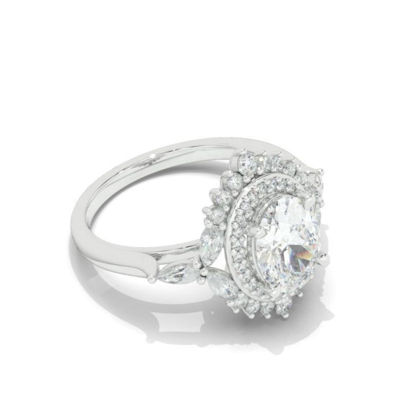 The default design option features 9x7mm Oval Cut LAB-Grown Diamond Stone, D-Colorless VVS1-Clarity, VG-Cut, Ex-Polish, VG-Symmetry set with D- Colorless Accent Stones