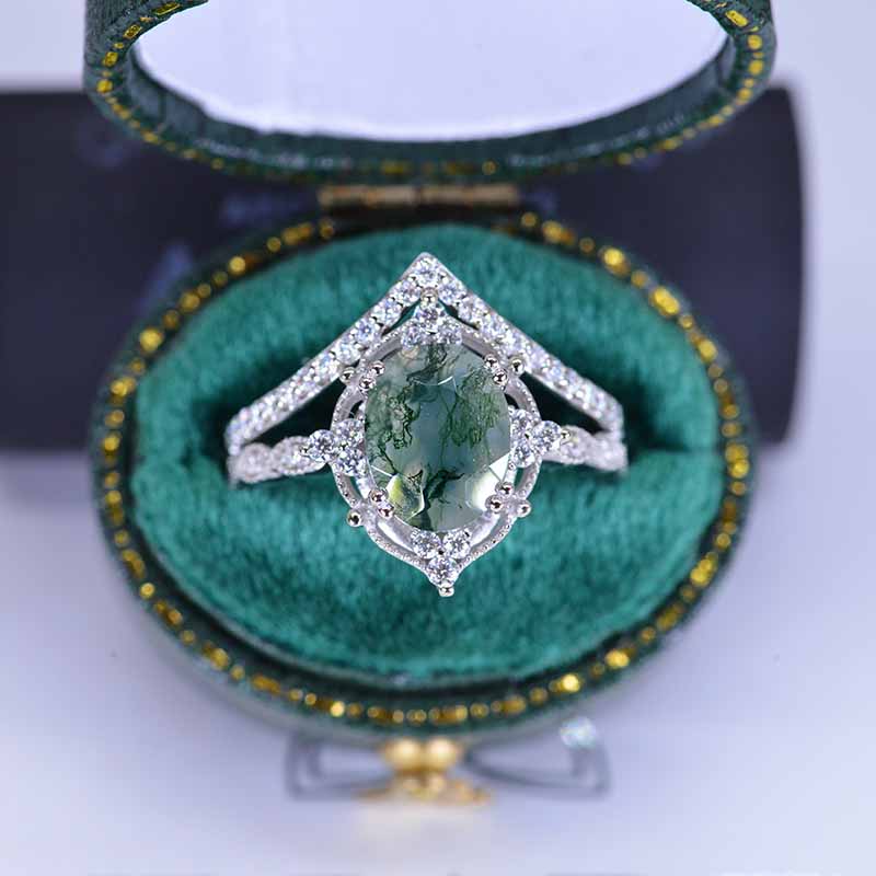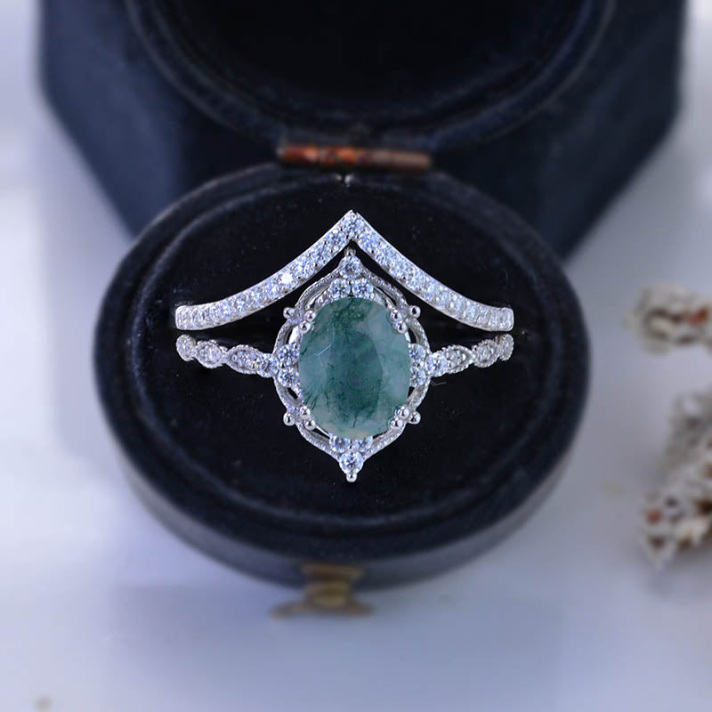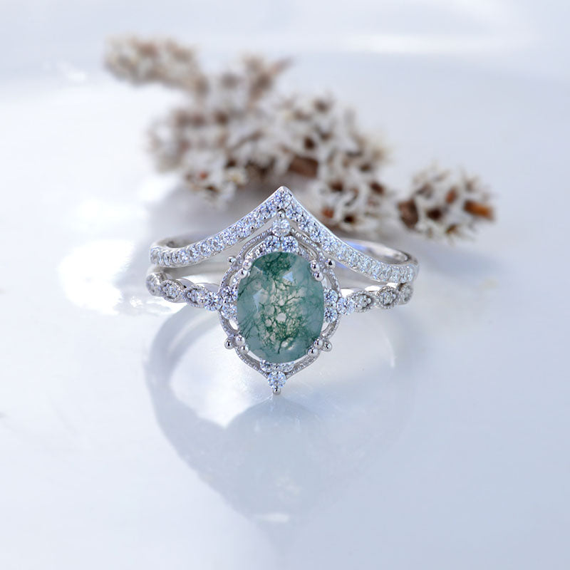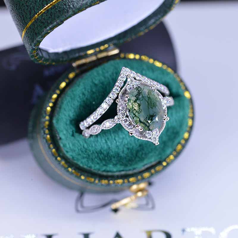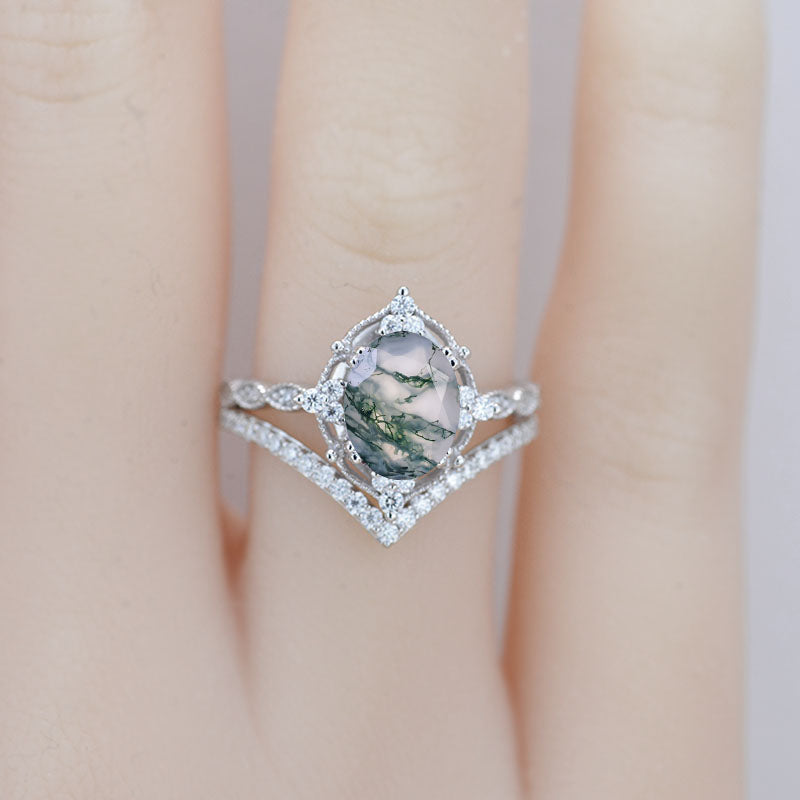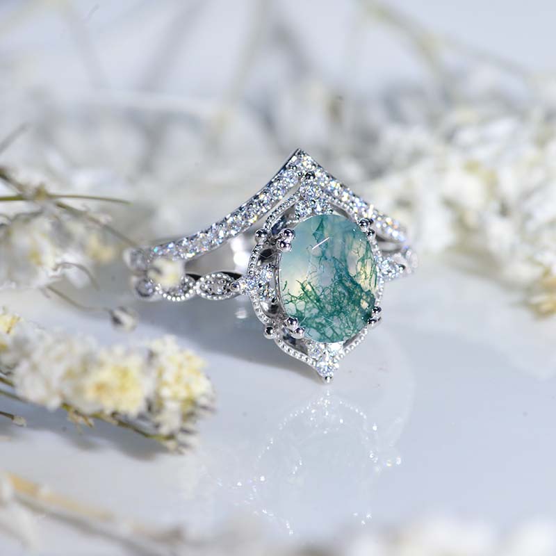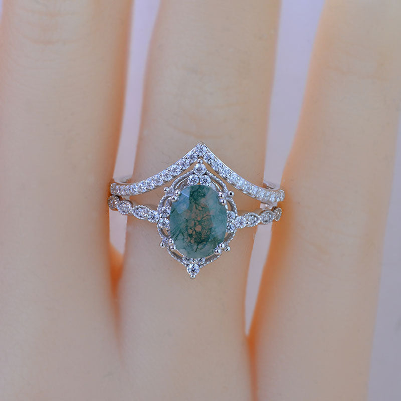 2CT Oval Moss Agate Vintage Wedding Ring, Oval Agate Halo Engagement Ring Set Model 474-9x7