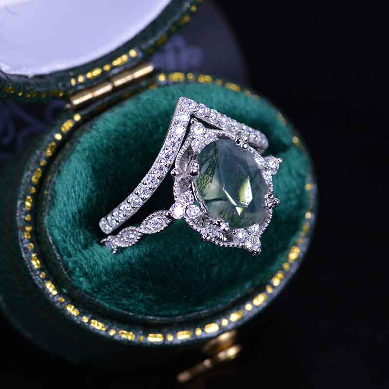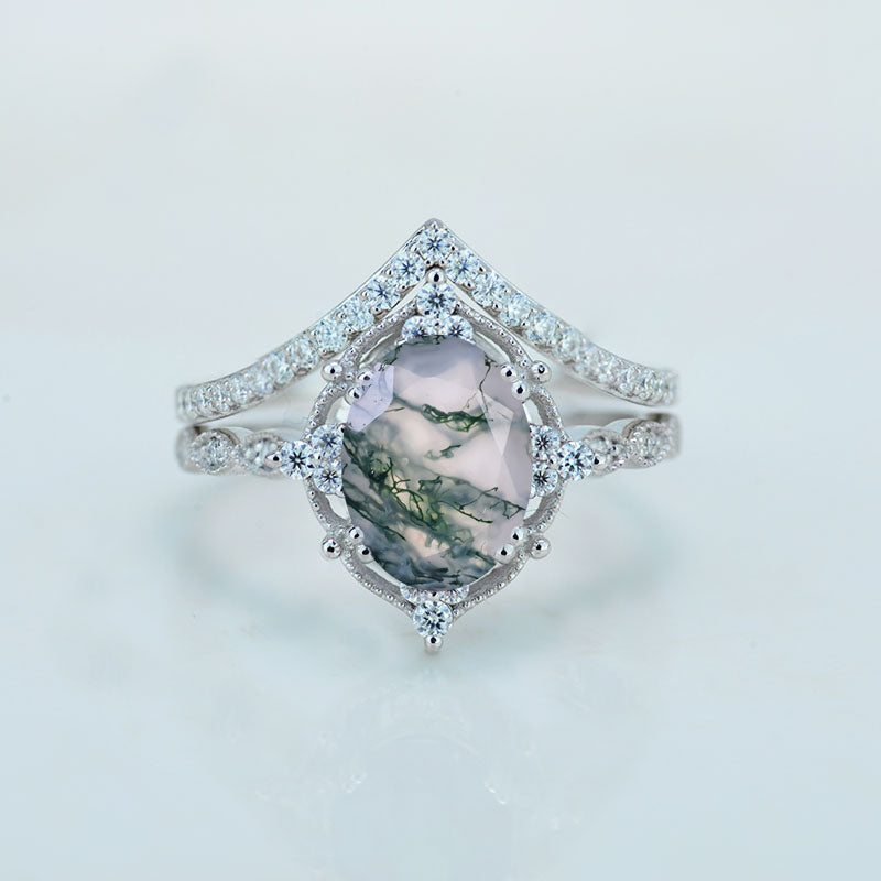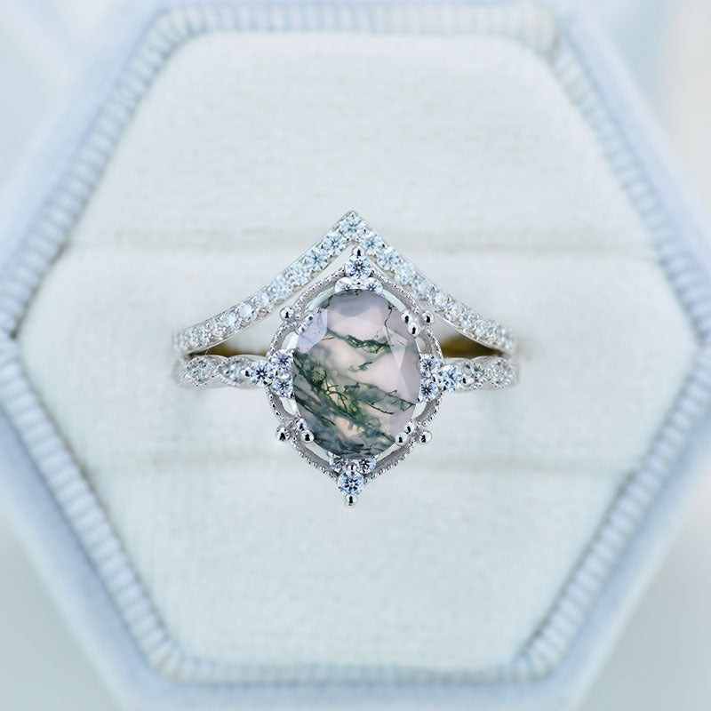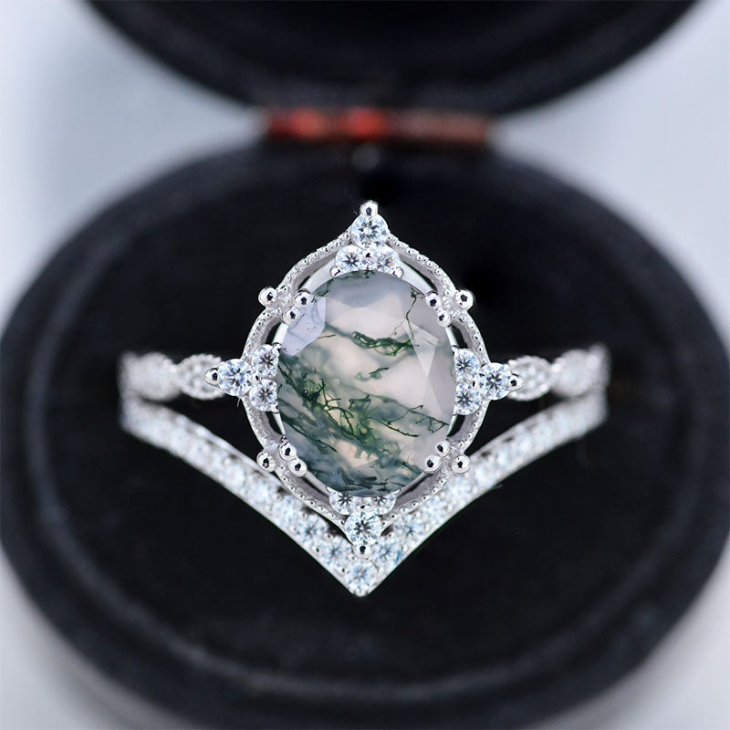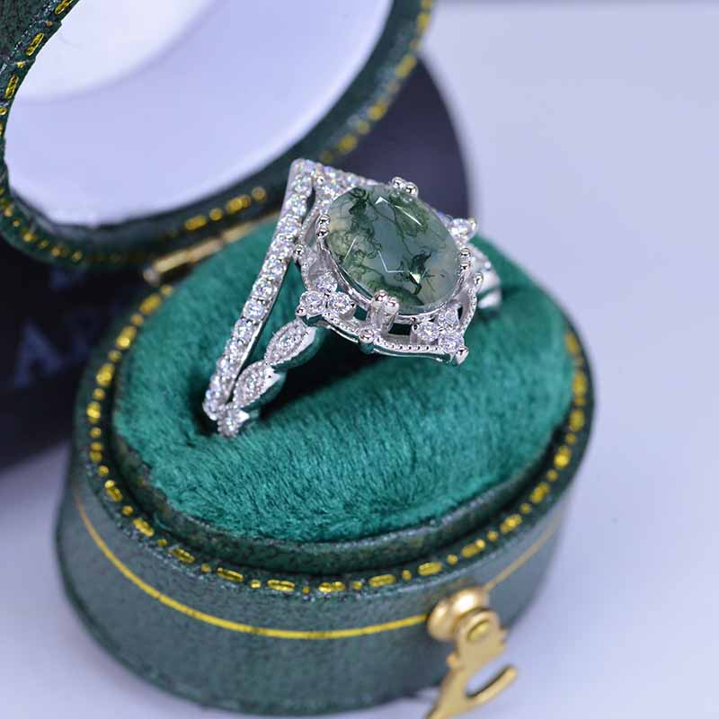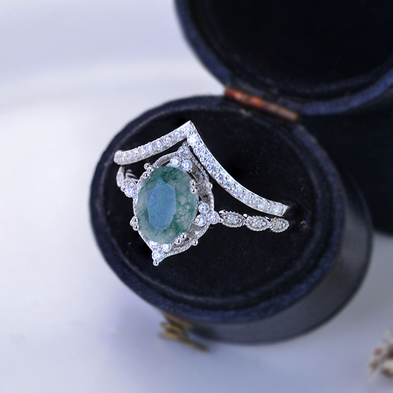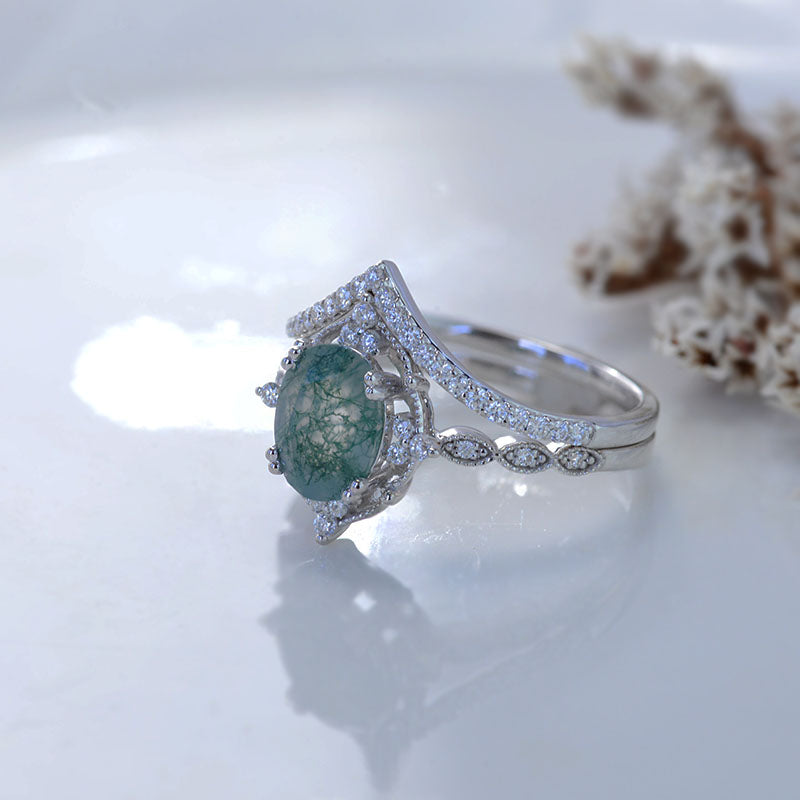 2CT Oval Moss Agate Vintage Wedding Ring, Oval Agate Halo Engagement Ring Set Model 474-9x7