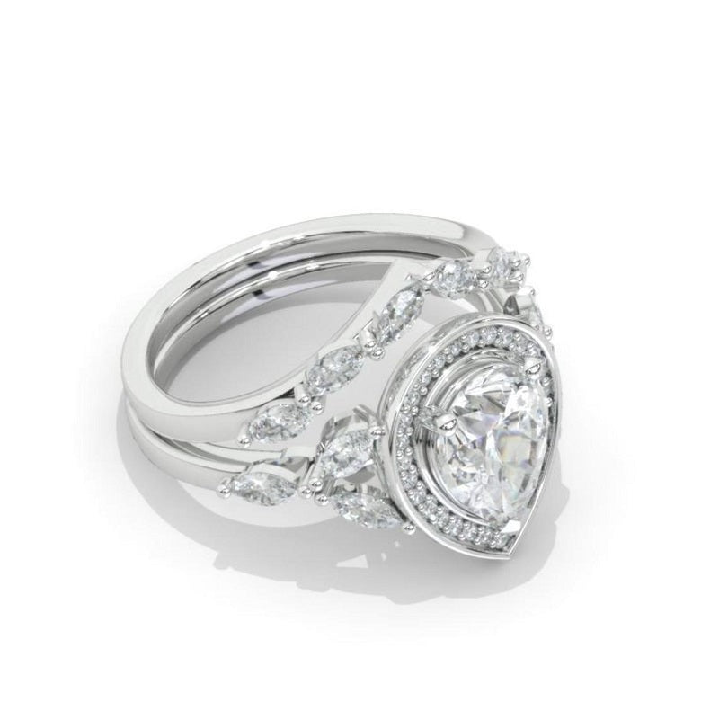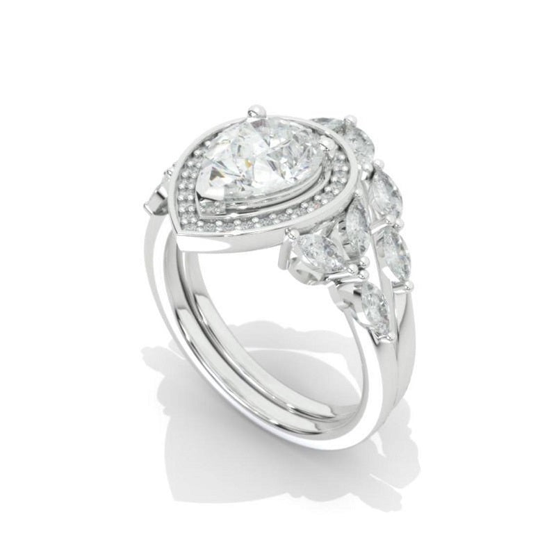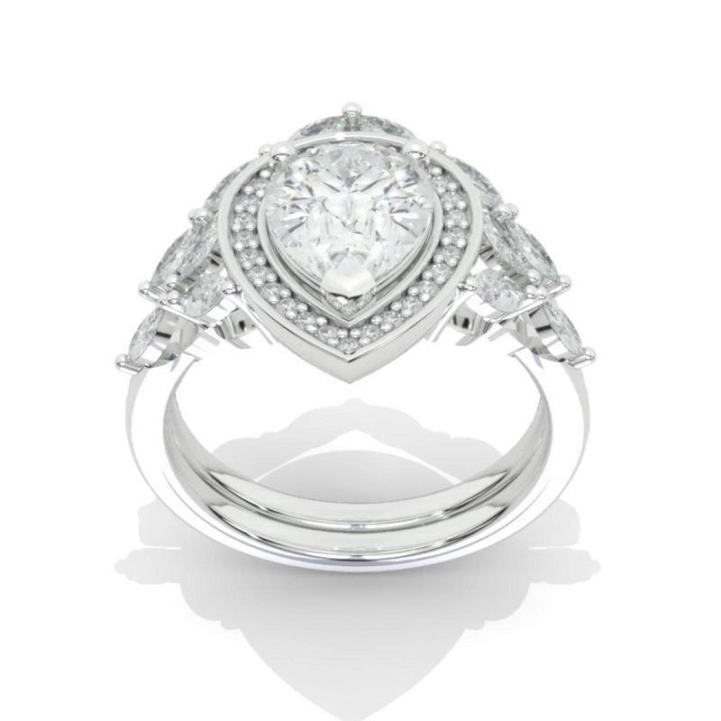 The default design option features 9x7mm Pear Center LAB-Grown Diamond D-Colorless VVS1-Clarity, VG-Cut, Ex-Polish, VG-Symmetry, Set with Colorless LAB-Grown Diamond Accent stones in 14K White Gold Engagement Ring Set.