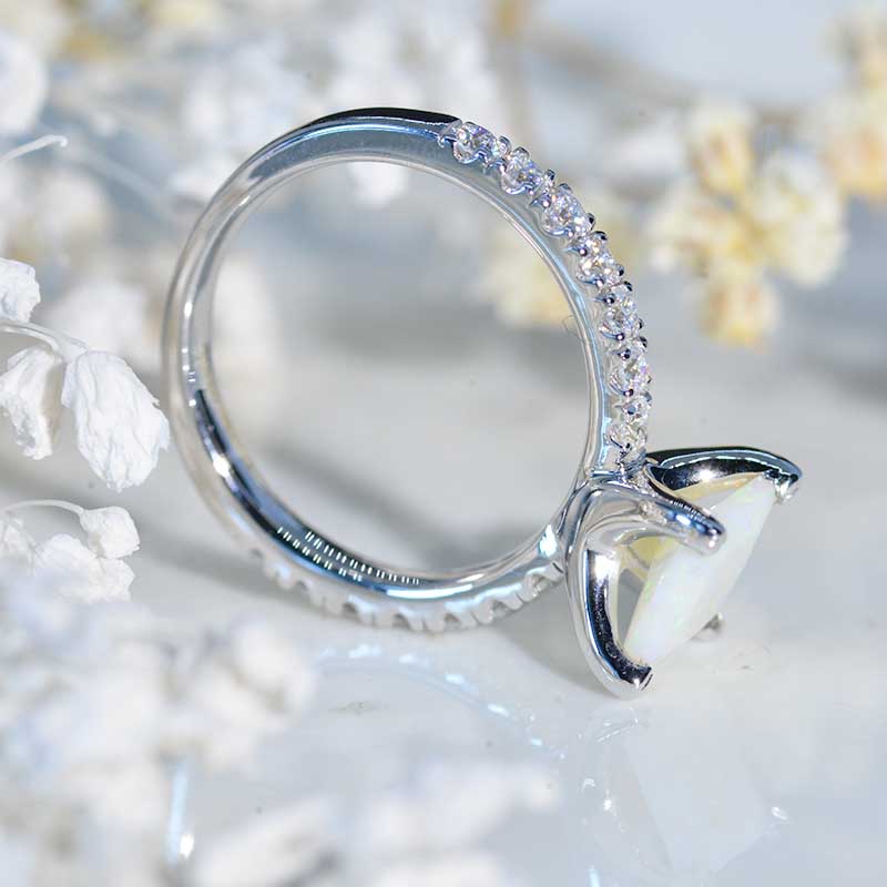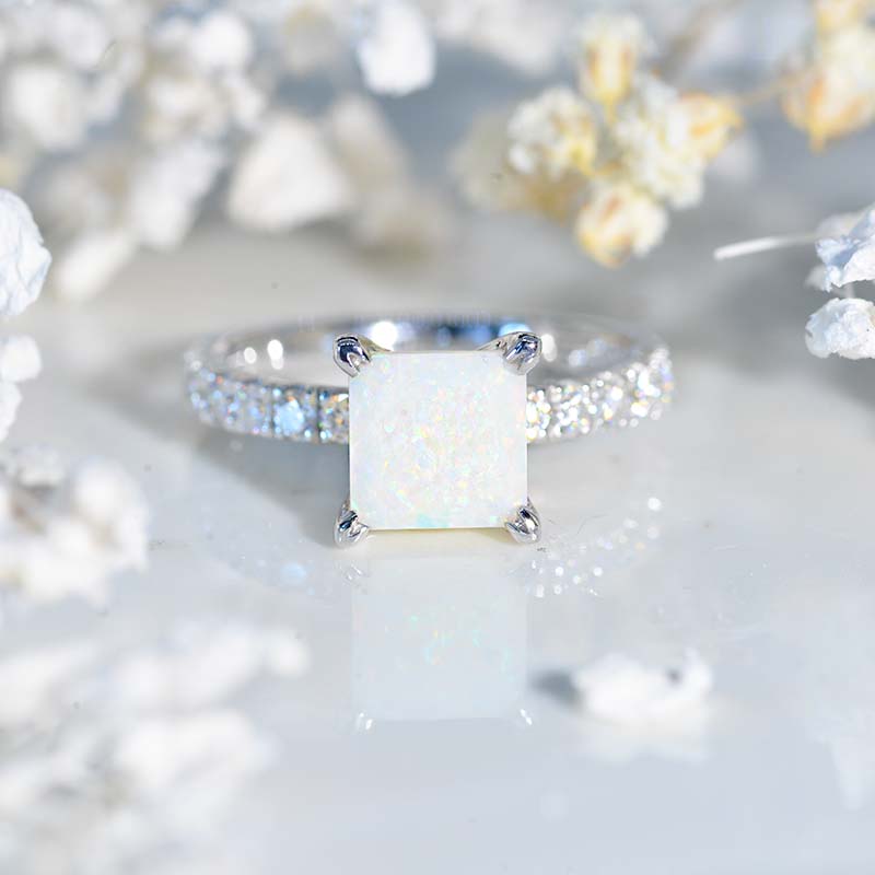 The default design option features 7x7 mm princess cut Natural White Opal stone, VG-Cut, Ex-Polish, VG-Symmetry set with D-Colorless Moissanite Accents