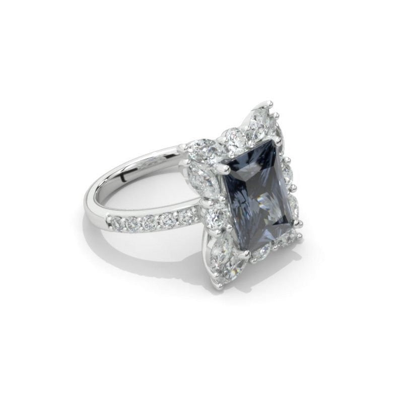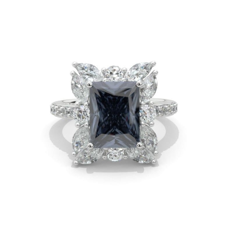 The default design option features 8x6mm Radiant Cut Moissanite stone Classic Halo Accent Stones, Radiant Shape D-Colorless, VVS1-Clarity, VG-Cut, Ex-Polish, VG-Symmetry