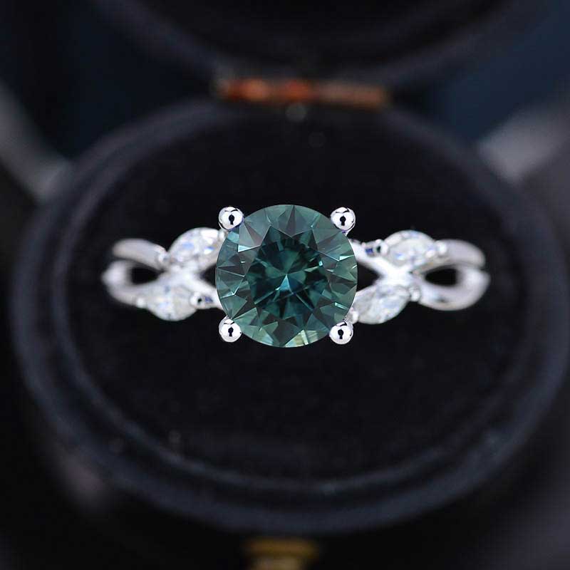 The default design option features 8mm Round Cut Ethically Lab-Grown Teal Sapphire Stone