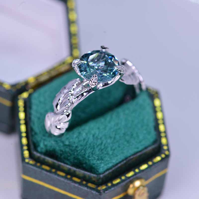 2Ct Teal Sapphire 14K White Gold Engagement Ring, Design Floral Twig Style Engagement Ring, Leaf Promissory Ring.