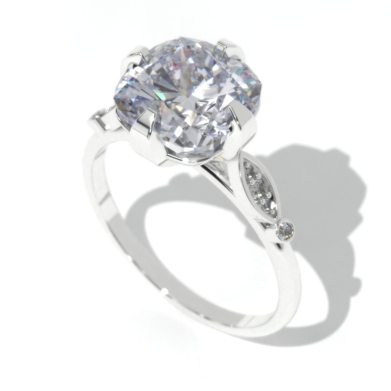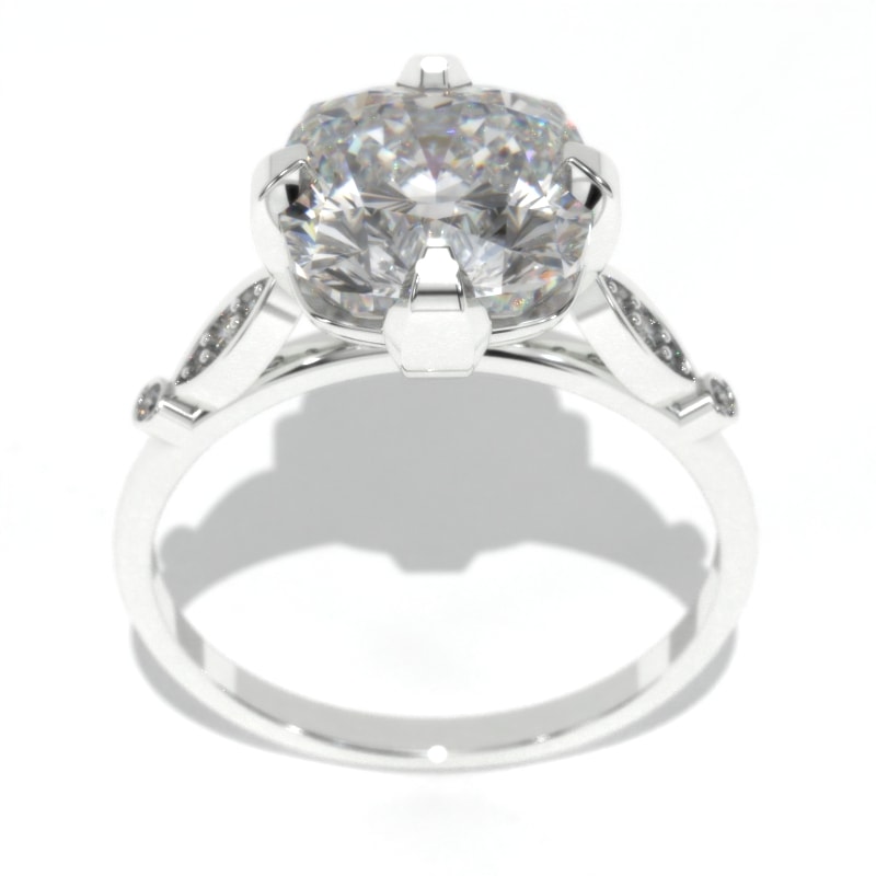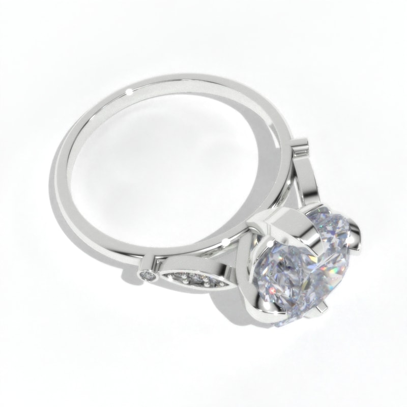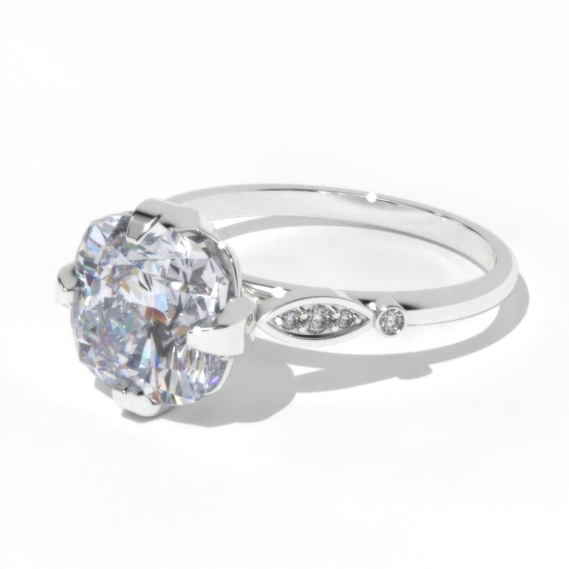 3.0 Carat Moissanite Center Stone (Cushion 9x9mm, D-Colorless, VVS1-Clarity, Ex-Cut, Ex-Polish, VG-Symmetry) in 14K White Gold Floral Engagement Ring.