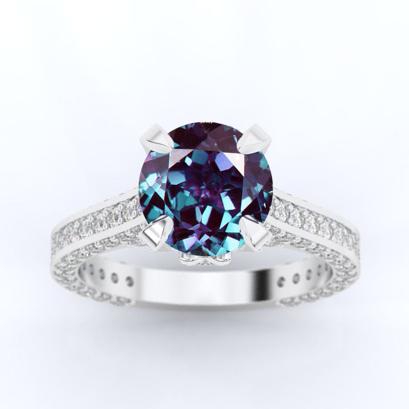 2.0 Carat Ethically LAB-Grown Alexandrite center stone (Round 8mm, Ex-Cut, Ex-Polish, VG-Symmetry) and 120 diamond  accent stones  ( 1.2 CTW D-Colorless, VVS1 clarity) with  14K white gold.