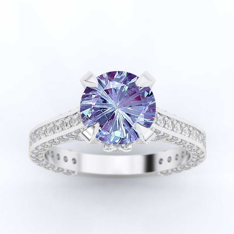 2.0 Carat Fireworks Cut Ethically LAB-Grown Alexandrite center stone (Round 8mm, Ex-Cut, Ex-Polish, VG-Symmetry) and 120 diamond  accent stones  ( 1.2 CTW D-Colorless, VVS1 clarity) with  14K white gold.