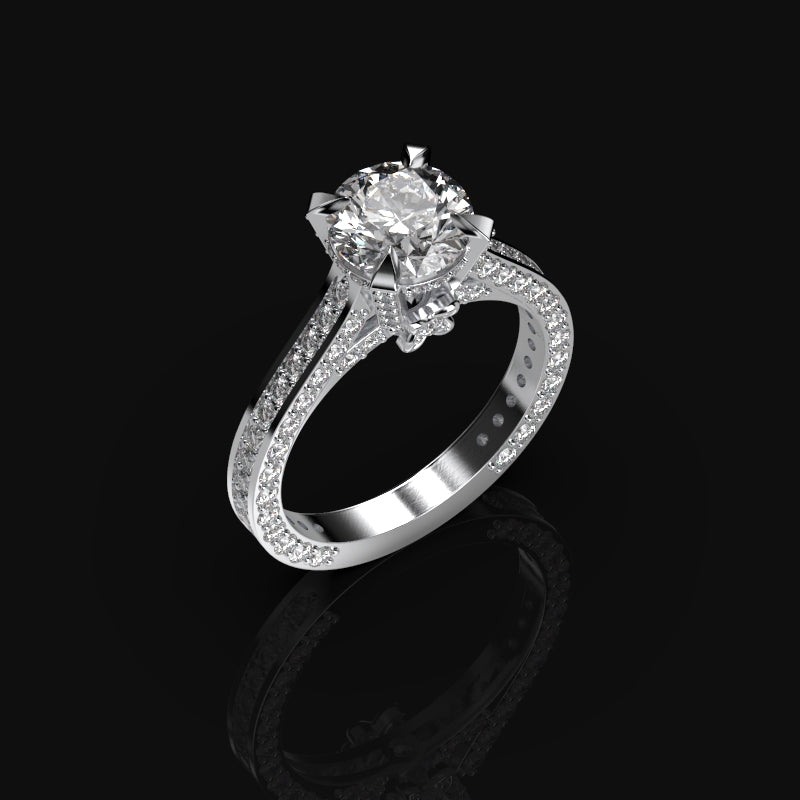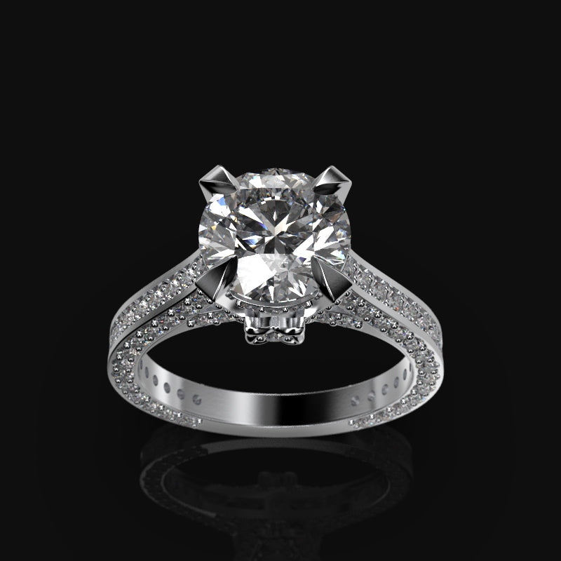 2.0 carat Moissanite center stone (round 8 mm, G-H color Ex-Cut, Ex-Polish, VG-Symmetry) and 120 diamond accent stones ( 1.2 CTW G-H color, I1 clarity) with 14K white gold.