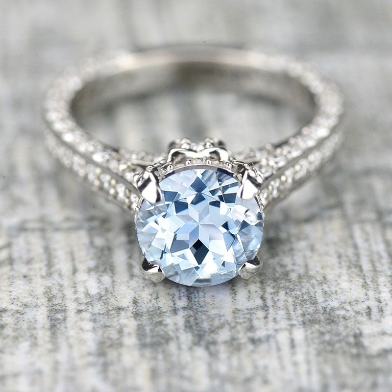 2.0 Carat Genuine Natural Aquamarine center stone (Round 8mm, Ex-Cut, Ex-Polish, VG-Symmetry) and 120 diamondĀ  accent stonesĀ  ( 1.2 CTW D-Colorless,Ā VVS1 clarity) with Ā 14K white gold.