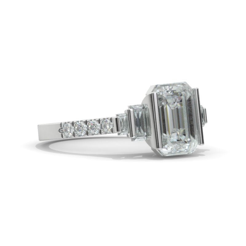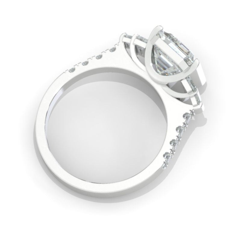 3.5 Carat Giliarto Moissanite Emerald Cut 10x7mm D-Colorless, VVS1-Clarity, VG-Cut, Ex-Polish, VG-Symmetry Center Stone and -0.6 C.T.W. D-Colorless, VVS1 Clarity Accent Stones in 14K White Gold Floral Ring.Â