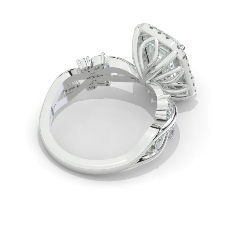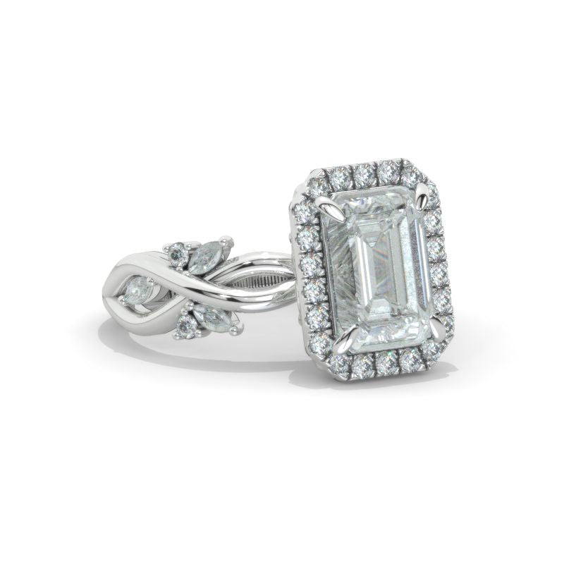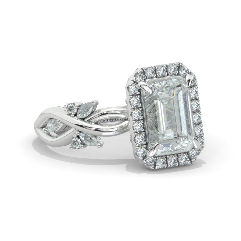 3.5 Carat Giliarto Moissanite Emerald Cut 10x7mm D-Colorless, VVS1-Clarity, VG-Cut, Ex-Polish, VG-Symmetry Center Stone and -0.4 C.T.W. D-Colorless, VVS1 Clarity Accent Stones in 14K White Gold Floral Ring.Â