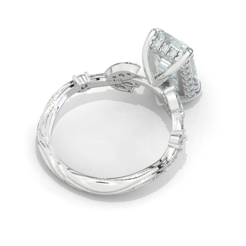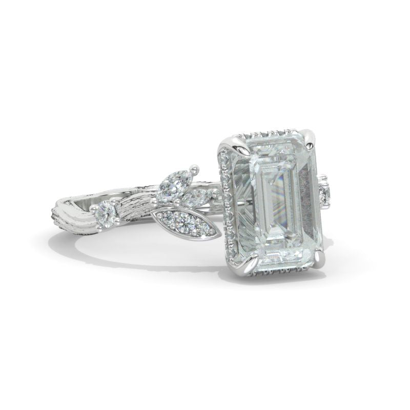3.5 Carat Giliarto Moissanite Emerald Cut 10x7mm D-Colorless, VVS1-Clarity, VG-Cut, Ex-Polish, VG-Symmetry Center Stone and - 0.42 C.T.W. D-Colorless, VVS1 Clarity Accent Stones in 14K White Gold Hidden Halo Floral Ring.Â