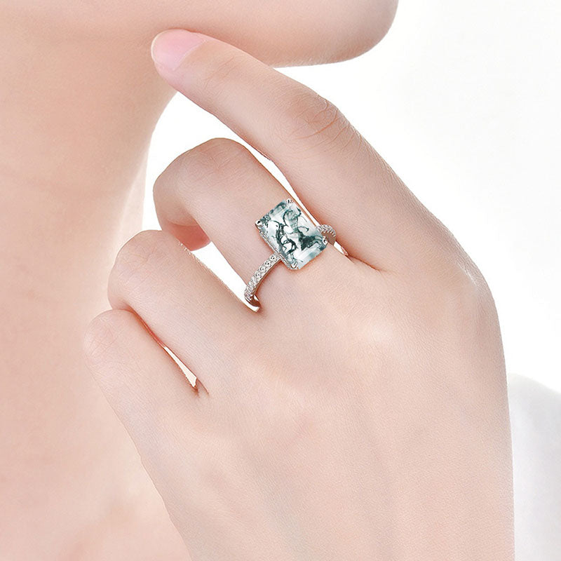 3.8 Carat Genuine Moss Agate Emerald Cut Engagement Gold Ring.