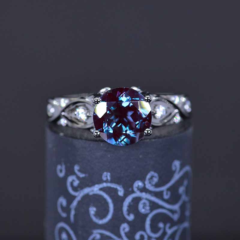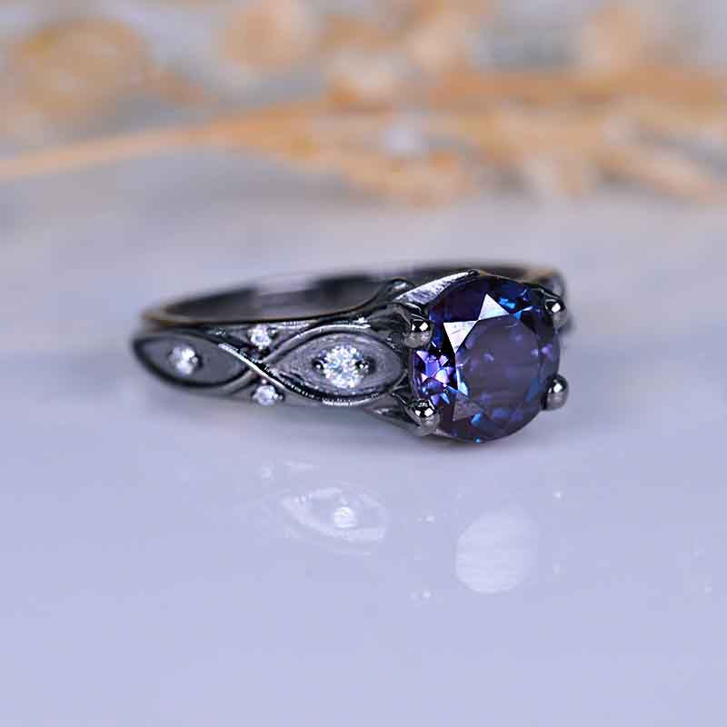 3 Carat Ethically LAB-Grown Alexandrite Center Stone-Round 9mm, VVS2-Clarity, Ex-Cut, Ex-Polish, VG-Symmetry) and 8 - Moissanite Accents  0.1 CTW with 14K Black Gold.