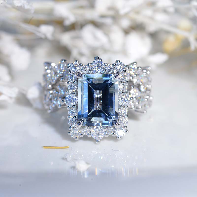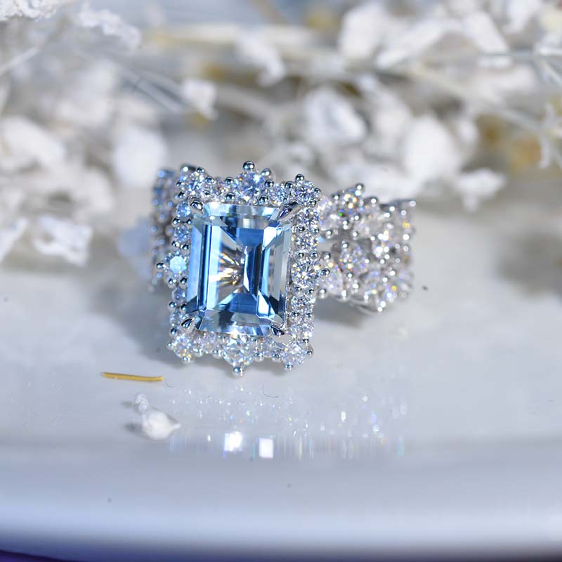 3 Carat Aquamarine Engagement Ring Halo Emerald Cut Genuine Aquamarine - Giliarto