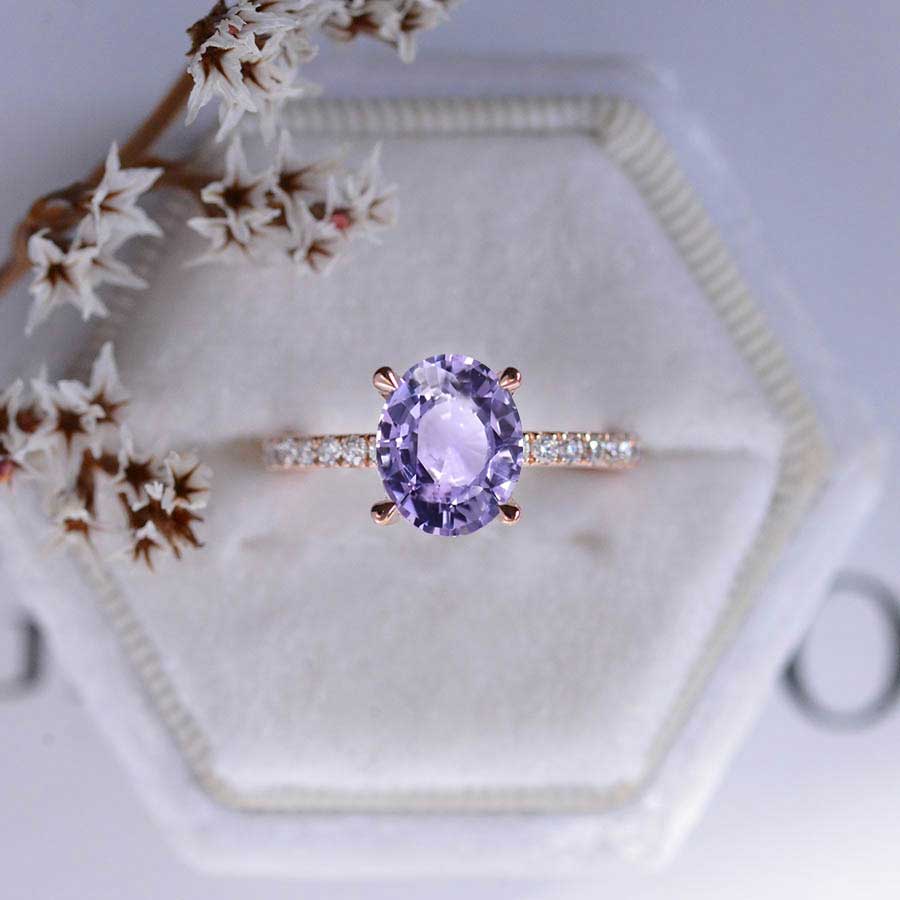 3 Carat Oval Cut 10x8mmEthically Lab-Grown Purple Sapphire Center Stone, Ex-Cut, Ex-Polish, VG-Symmetry with 0.4 CTW Colorless Moissanite Accents 14K Rose Gold.
