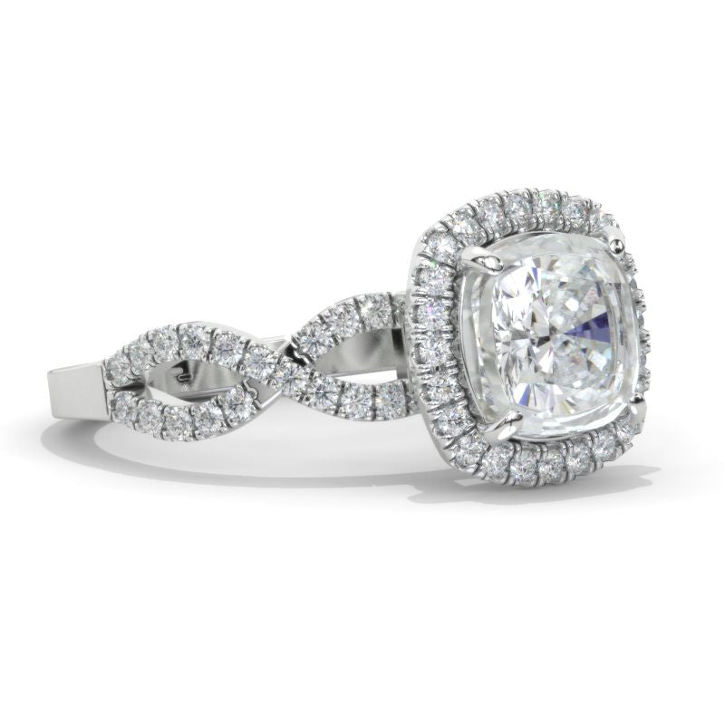 The default design option features Approximately 3+ Carat 8x8mm Cushion Cut LAB-Grown DiamondCenter Stone D-Colorless, VVS1-Clarity, VG-Cut, Ex-Polish, VG-Symmetry set with D- Colorless LAB-Grown Diamond Accent Stones