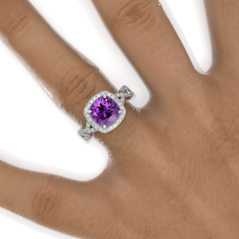 3 Carat Cushion Cut Vintage Style Halo Natural Amethyst White Gold Eng - Giliarto