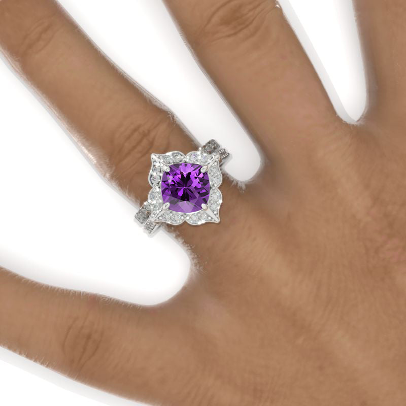 Engagement Ring: 3 Carat Genuine Natural Amethyst- AAAA Grade Center Stone Cushion 8x8mm and Moissanite Accents : D-Colorless, VVS1-Clarity, VG-Cut, Ex-Polish, VG-Symmetry Center Stone in 14K White Gold Ring.