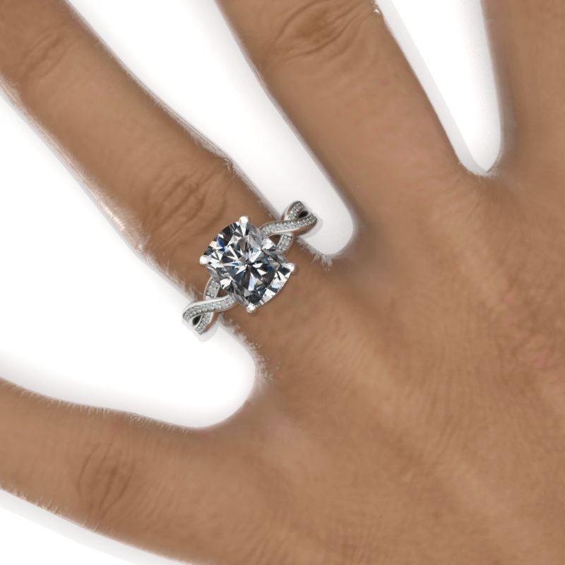 The default design option features 10x8mm Cushion Cut Gray Moissanite Stone, VVS1-Clarity, VG-Cut, Ex-Polish, VG-Symmetry with 0.7 CTW Moissanite Accent Stones