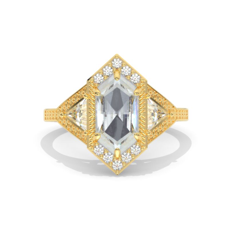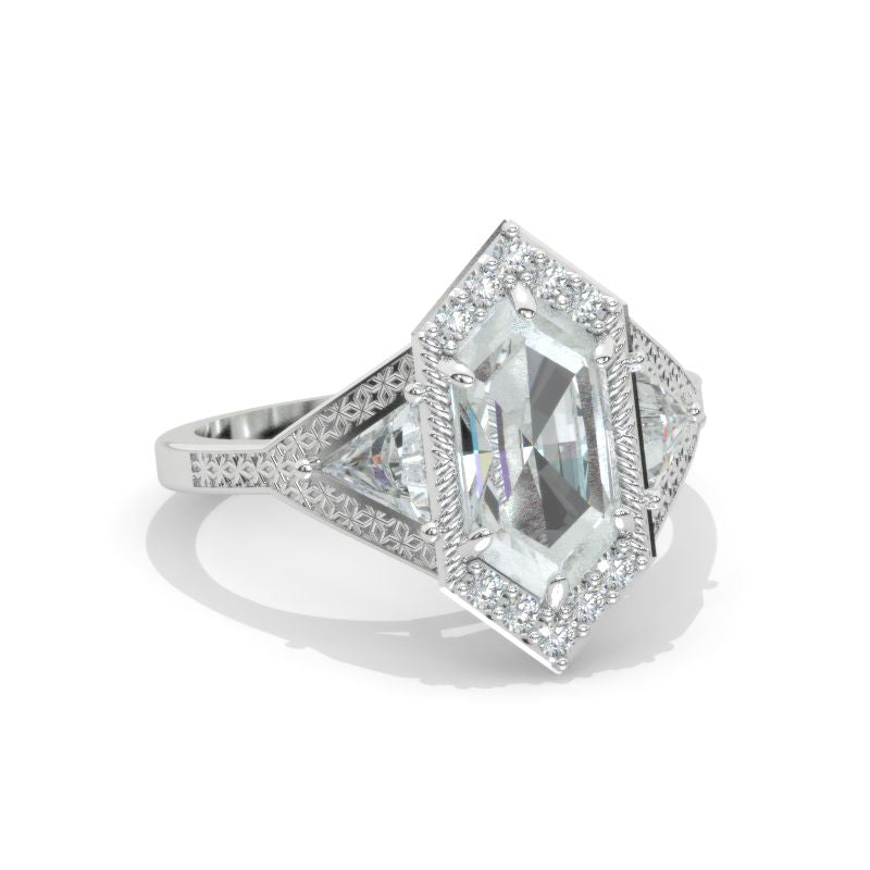 Engagement Ring: 3 Carat Giliarto Moissanite Hexagon 12x6mm D-Colorless, VVS1-Clarity, VG-Cut, Ex-Polish, VG-Symmetry Center Stone set with D- Colorless Moissanite Accent Stones  in 14K White Gold Ring.