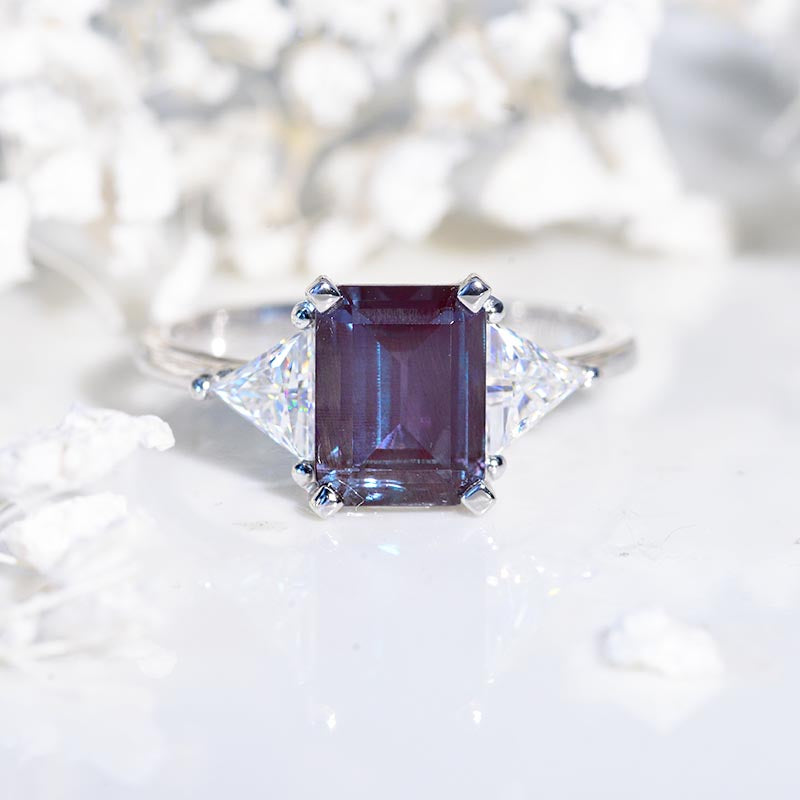 The default design option features approximately 3 Carat Ethically LAB-Grown Alexandrite Emerald Cut 9x7mm VVS1-Clarity,VG-Cut,Ex-Polish, VG-Symmetry Center Stone Set with Moissanite Accents (Colorless)