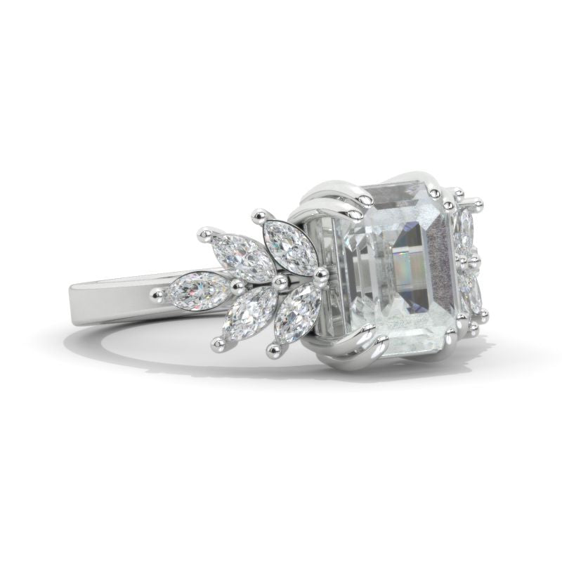 The default design option features 3 Carat 9x7mm Emerald Cut Giliarto Moissanite Center Stone set with 1.2 CTW Moissanite Accent Stone: D-Colorless, VVS1-Clarity, VG-Cut, Ex-Polish, VG-Symmetry