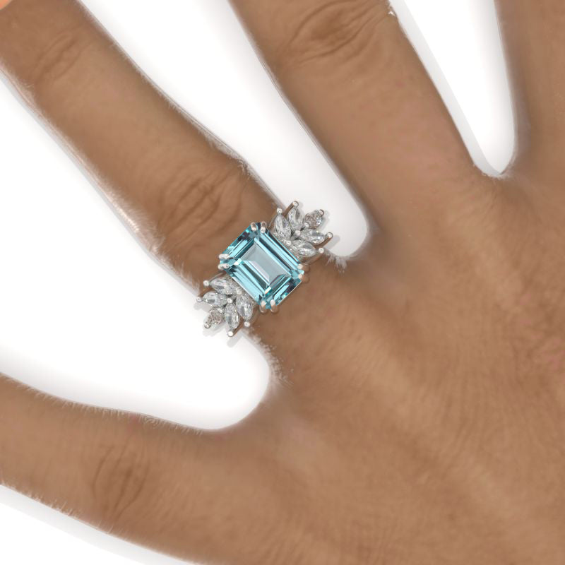 The default design option features 3 Carat 9x7mm Emerald Cut Ethically Lab-Grown Mint Sapphire Center Stone set with 1.2 CTW  Moissanite Accent Stone: D-Colorless, VVS1-Clarity, VG-Cut, Ex-Polish, VG-Symmetry